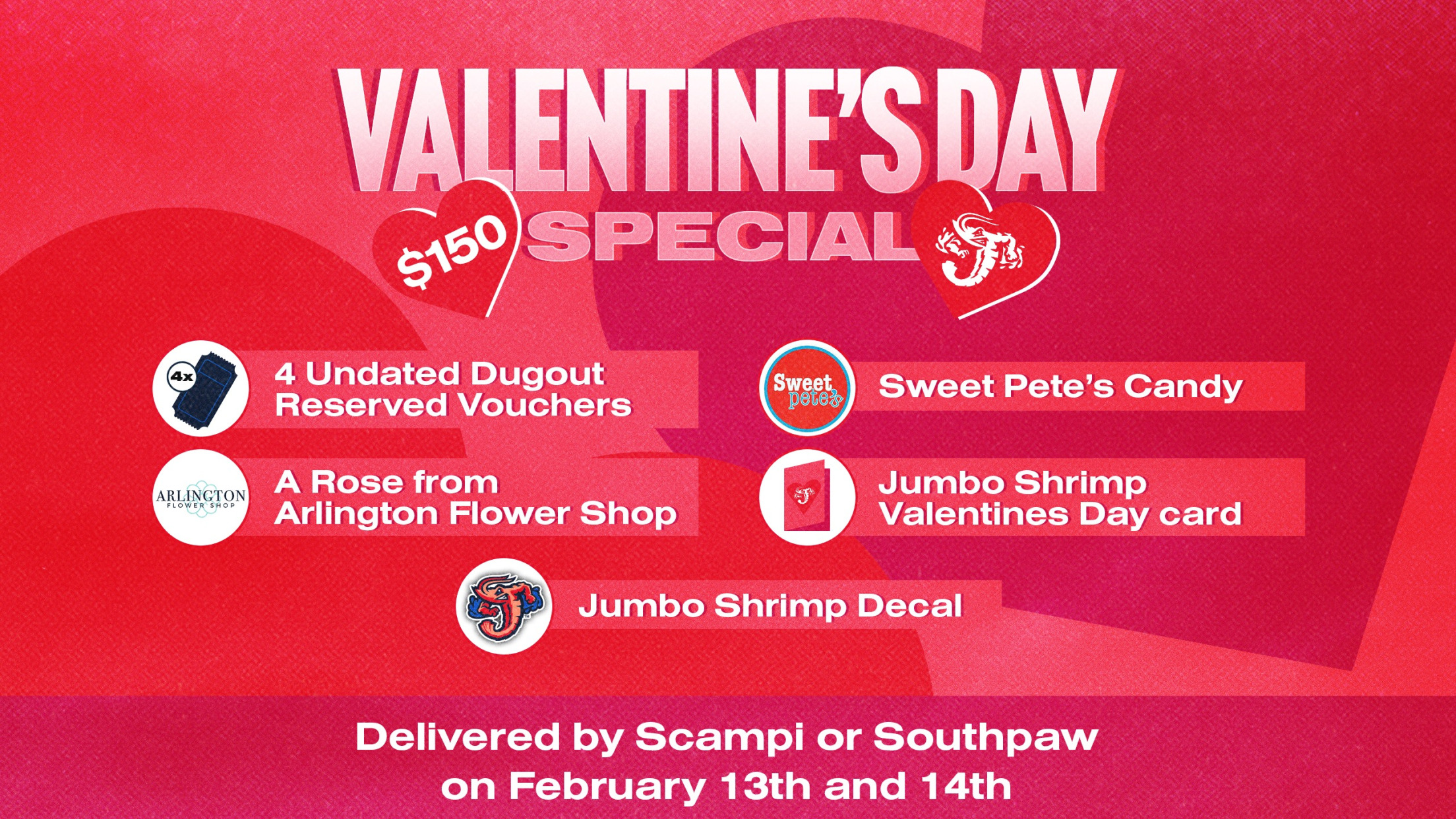 With Cupid’s big day right around the corner, the Jumbo Shrimp Sweetheart Surprise is a unique way to make a lasting impression on their loved one. The package includes a rose from Arlington Flower Shop, four undated reserved ticket vouchers for the 2024 season, Sweet Pete’s Candy, a Jumbo Shrimp Valentine’s Day card and Jumbo Shrimp decal – all for only $150.