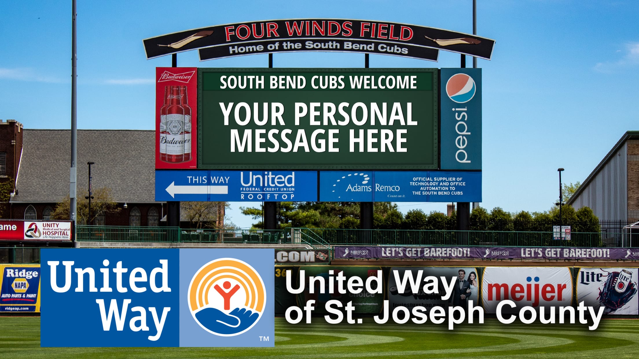 SOUTH BEND, IN – Due to the overwhelming response, the South Bend Cubs are once again offering fans the chance to purchase a video board message with proceeds benefiting a local charity. For a minimum donation of $10, fans can get their personalized message displayed on the video board at Four Winds Field and receive a digital copy of that message. All of the money raised in the month of May will go to the United Way of St. Joseph County.