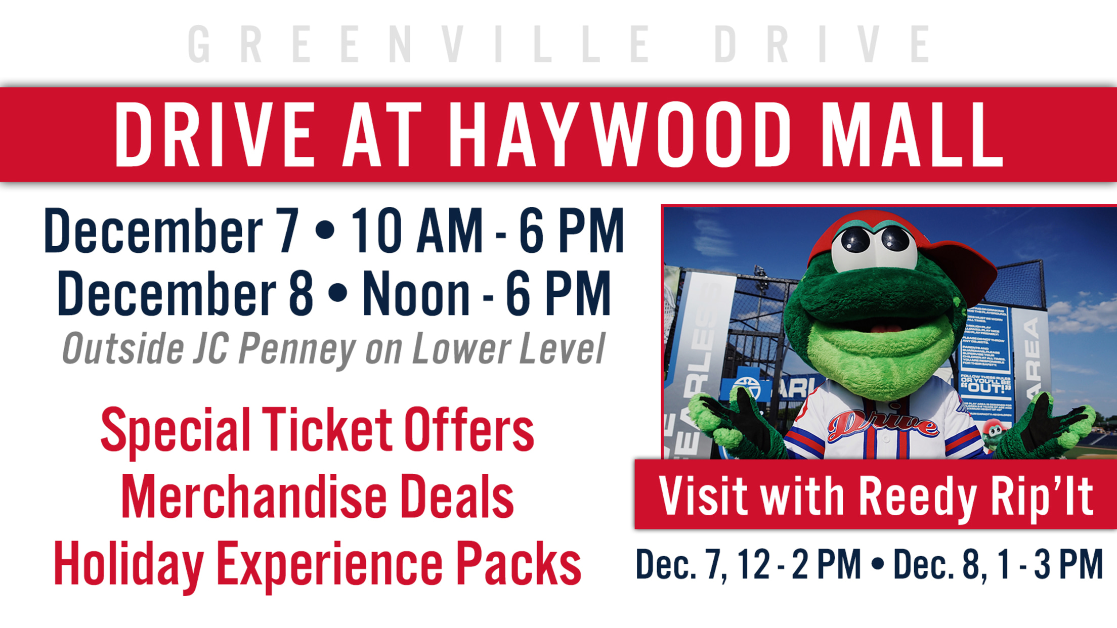 Visit the Greenville Drive at the Haywood Mall on Saturday, December 7 & Sunday, December 8 with appearances from Reedy Rip'It and a full selection of Drive merchandise available. The pop-up will open from 10 AM - 6 PM on Saturday and Noon - 6 PM on Sunday and located
