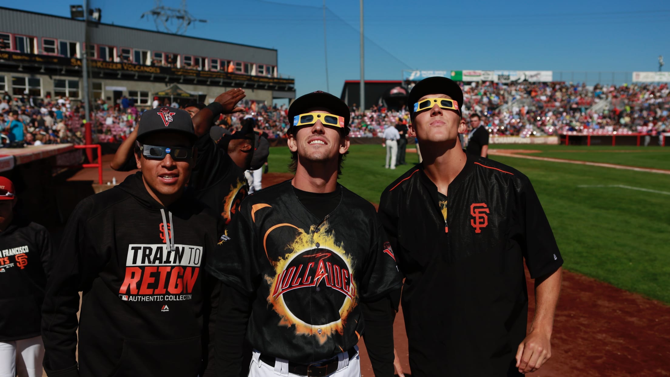 KEIZER, Ore -- Today's game between the Salem Keizer Volcanoes and Hillsboro Hops was delayed for 58 minutes after the top half of the first inning due to a total solar eclipse. At 10:15 a.m. PST, the stadium plunged into darkness and the crowd of 5,297 were left awestruck by the otherworldly spectacle. Eventually, the moon would move past the sun, the fans would remove their eclipse glasses, and play would resume.