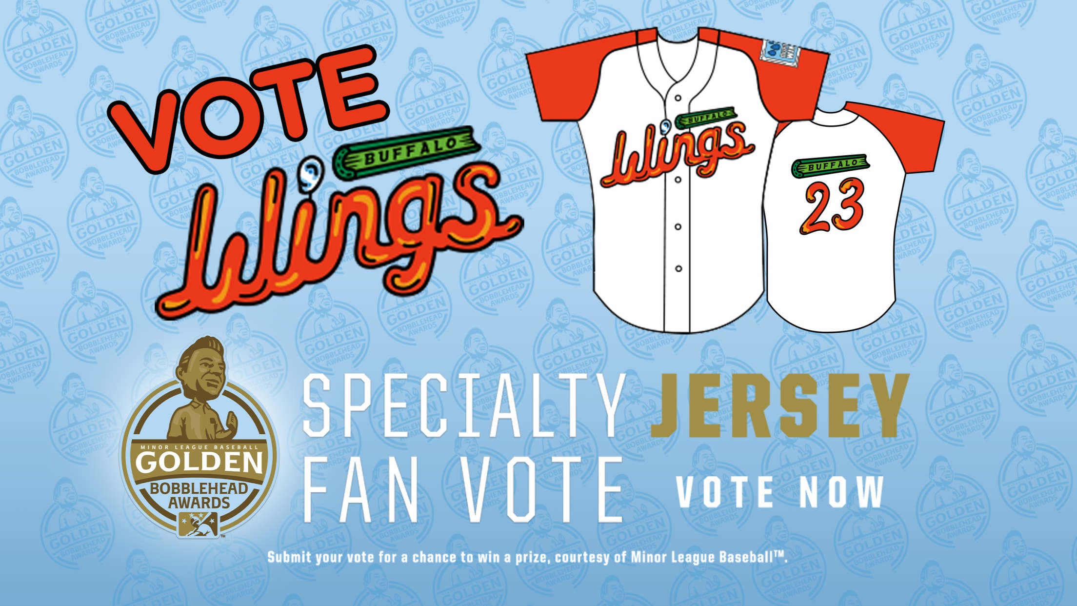 That's right, the brand new 'Buffalo Wings' Jersey is in the running, nominated in the category of 'Best Specialty Jersey' for this year's Golden Bobblehead Awards. There's two rounds of voting and the first part runs August 5-9.... and we need your votes.