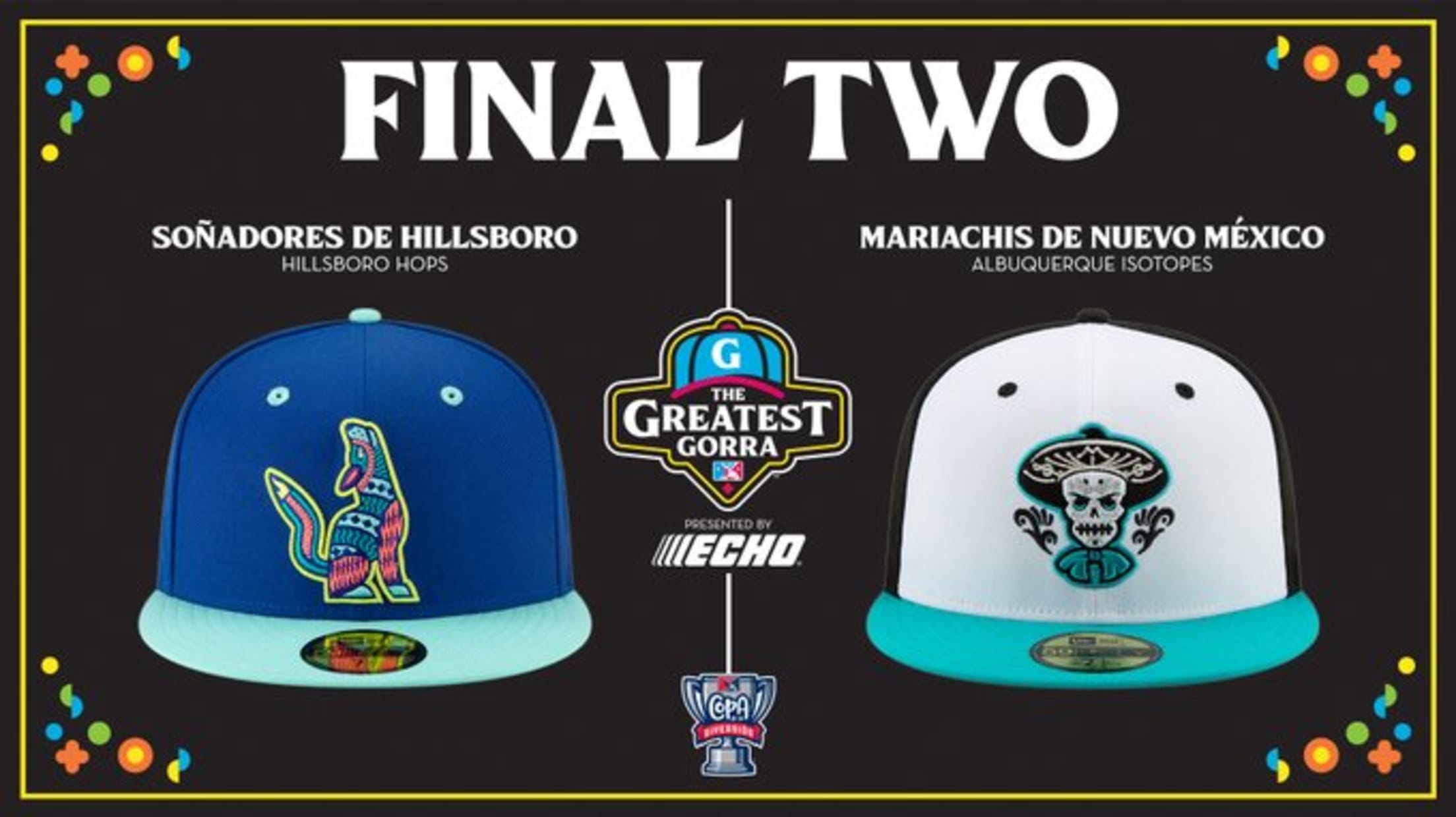 An initial field of 92 caps has been whittled to a pair of finalists in the battle to be named the "Greatest Gorra" in the Copa de la Diversión, Minor League Baseball’s initiative recognizing and honoring Hispanic and LatinX communities. Following more than two weeks of voting, the Soñadores de Hillsboro (Hillsboro Hops) and Mariachis de Nuevo Mexico (Albuquerque Isotopes) are going head-to-head after dispatching the Medusas de Lakewood (Lakewood BlueClaws) and Llamas de Hickory (Hickory Crawdads) in the semifinals.