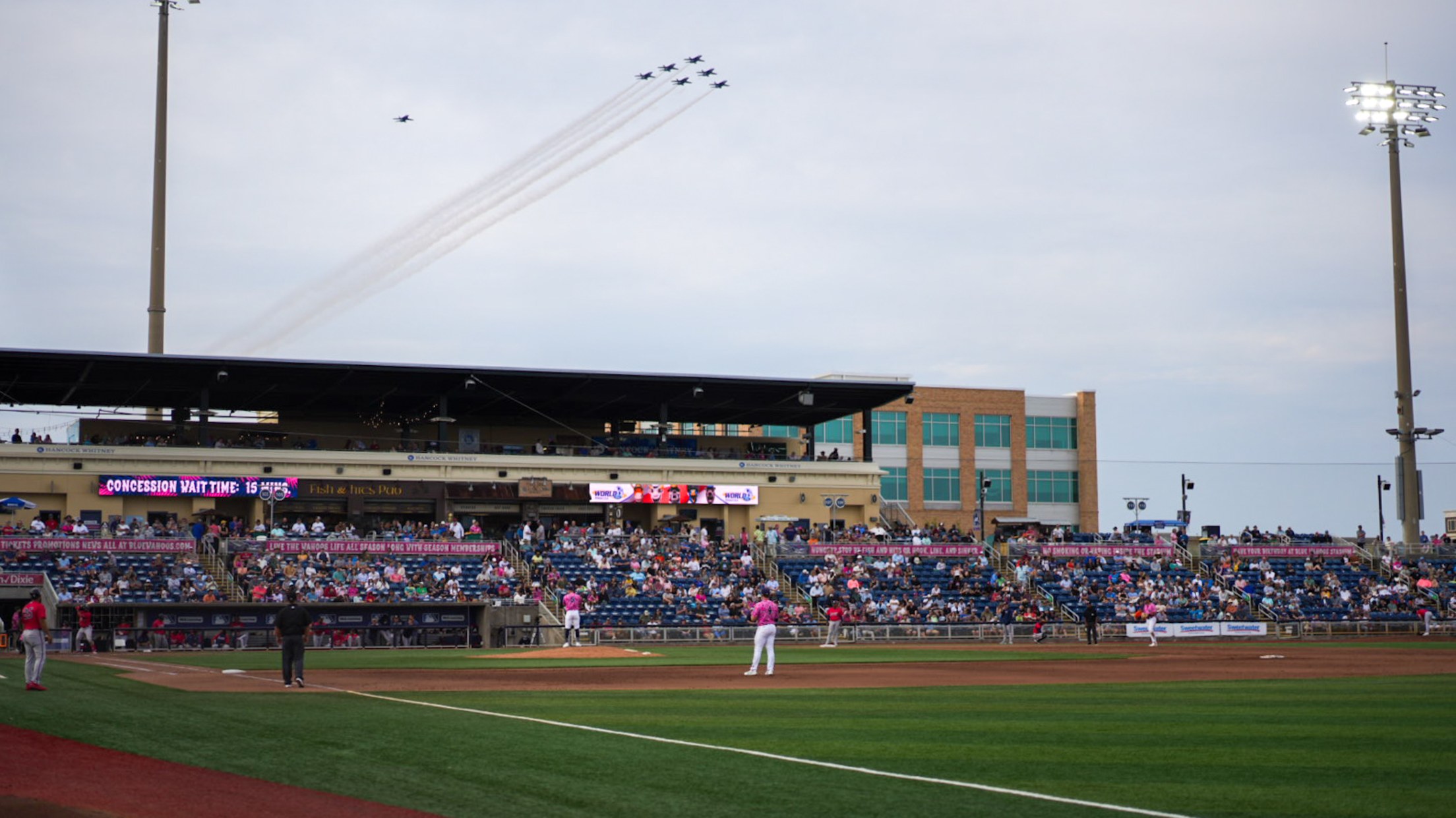 A sellout crowd of 5,038 - the third sellout in as many games - enjoyed a surprise flyover from the Blue Angels and support aircraft Fat Albert in the sixth inning as the ace flyers made their Sunday afternoon tour over downtown Pensacola.