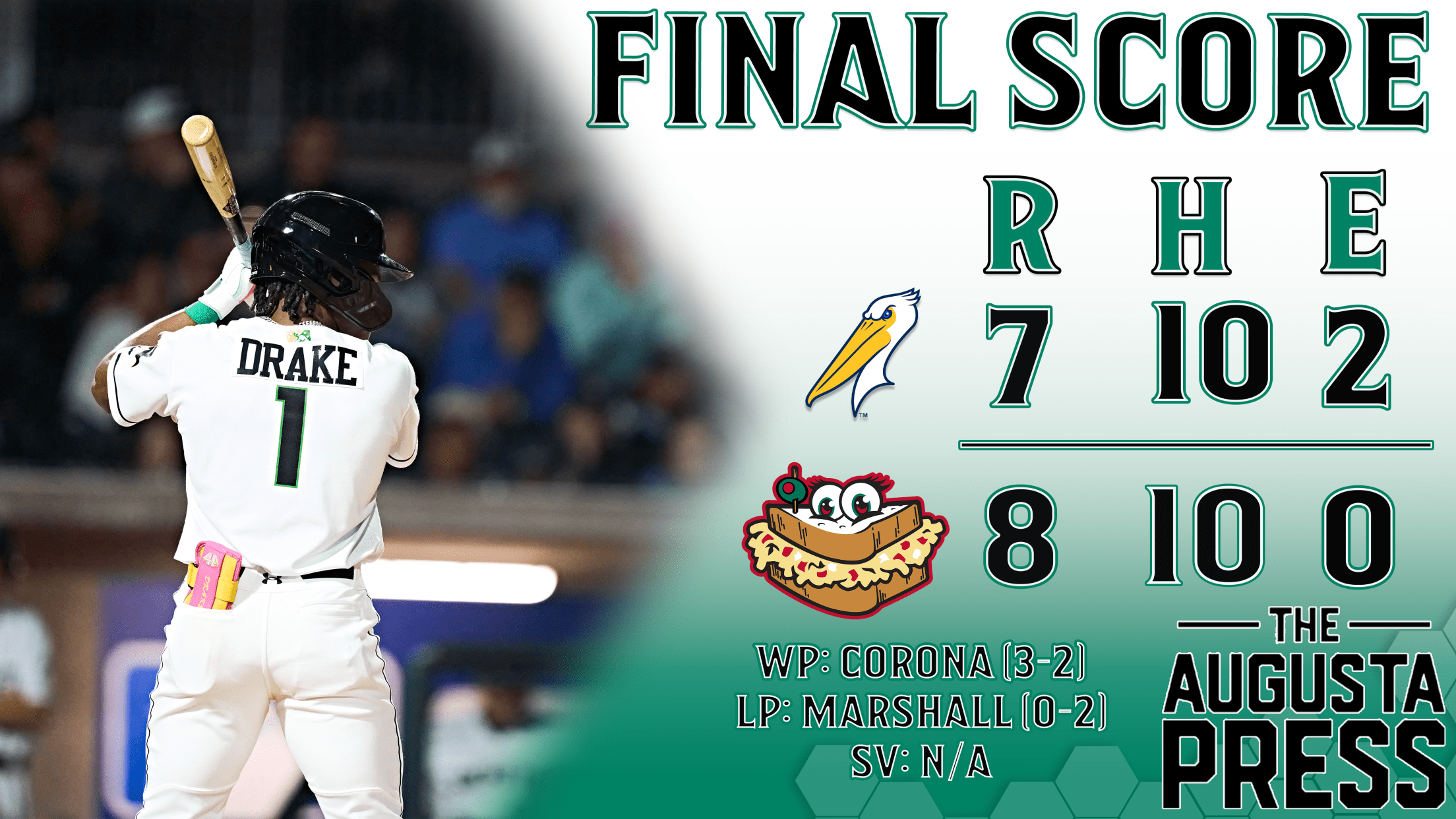 The Pelicans were in no way hesitant to get in on the action, jumping on Garrett Baumann in their second trip through the order. The Pelicans tagged Baumann for a career-high 7 runs and 9 hits, scoring 4 in the 3rd and 3 in the 4th to open up a big lead. Augusta got one run back as Isaiah Drake crushed the first home run of his professional career, but the Pimento Cheese still stared down a 7-3 deficit after 4 innings.
