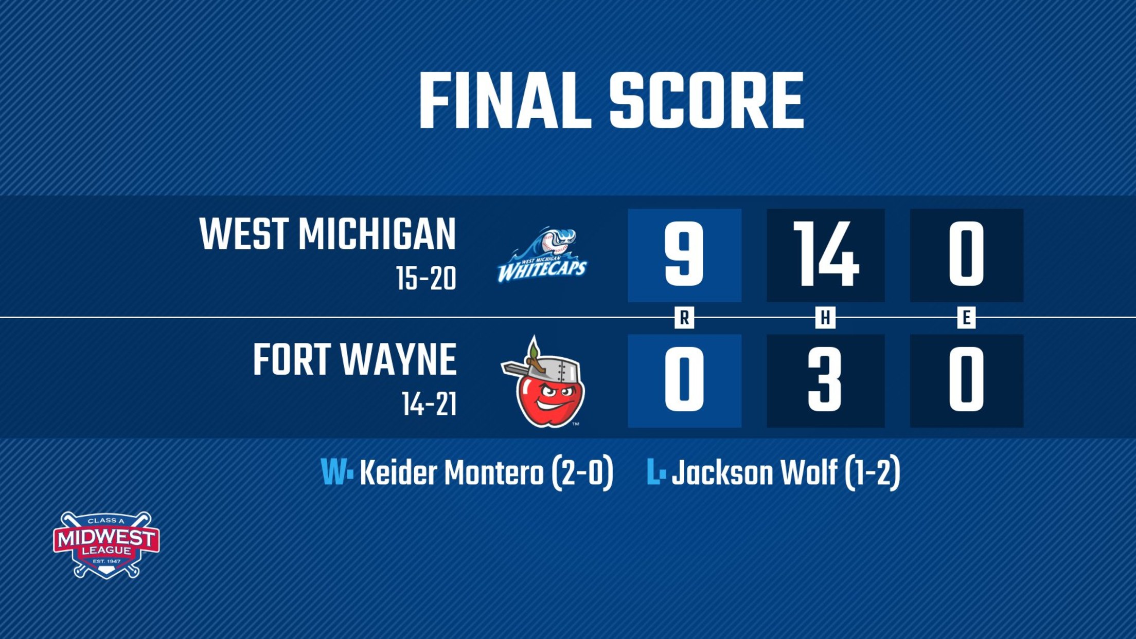 Montero (2-0) collects his second win in as many starts after striking out four batters in five scoreless, one-hit innings, while TinCaps lefty Jackson Wolf (1-2) gave up three runs in five frames in taking his second defeat. The Whitecaps avoid last place in the Midwest League Eastern Division, improving their record to 14-20, while Fort Wayne falls to 14-21. Montero has received the most run support of any Whitecaps starting pitcher this season at over eight runs per game in his six starts. Colt Keith went 3-for-5 with two runs scored, and Crouch, Malgeri, and Cruz collected a pair of base hits in the victory.