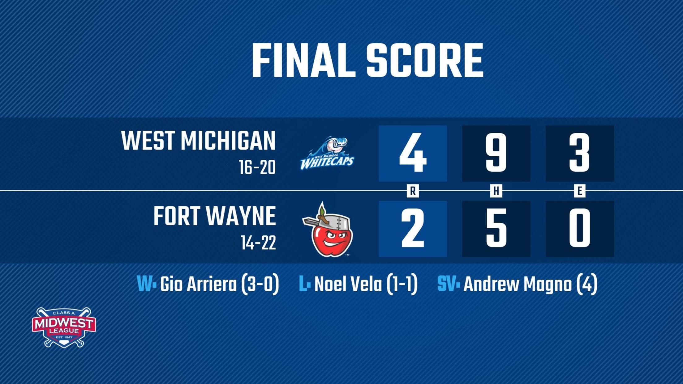 Reliever Gio Arriera (3-0) was superb in two scoreless innings out of the ‘Caps bullpen to record his third victory of 2022, while Vela (1-1) pitched just 2.1 innings, giving up all four West Michigan runs to increase his ERA to 1.55 in suffering his first loss. Andrew Magno pitched a scoreless ninth, finishing it with a game-ending strikeout of Top-100 MLB Prospect Robert Hassell III to end the contest and earn his fourth save. The Whitecaps record improves to 16-20, while Fort Wayne falls to 14-22. Holton and Crouch each enjoyed multi-hit performances in the victory. The two-hit game for Crouch gives him two hits in each of the three games in the series. The ‘Caps picked up the win despite committing a season-high three errors.