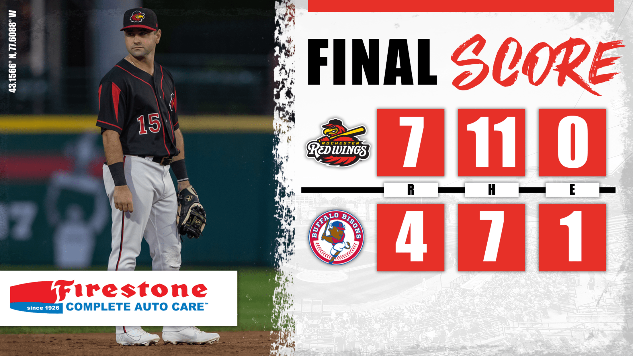 The Rochester Red Wings took the rubber match against the Buffalo Bisons by a score of 7-4 on Saturday. The Wings opened scoring in the top of the first on a sacrifice fly by 1B John Nogowski, scoring CF Andrew Stevenson.