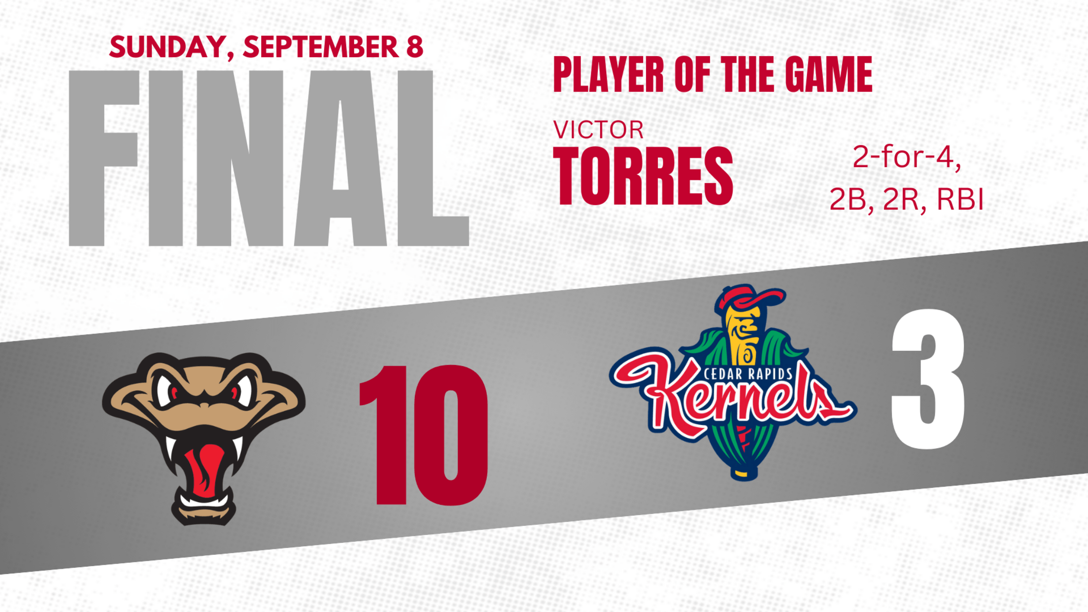 CEDAR RAPIDS, IA – The Wisconsin Timber Rattlers tuned up for a playoff run with a 10-3 victory over the Cedar Rapids Kernels on Sunday afternoon at Rise 2 Greatness Field in the regular season finale for both teams. Wisconsin hit three homers and stole five bases in the game.