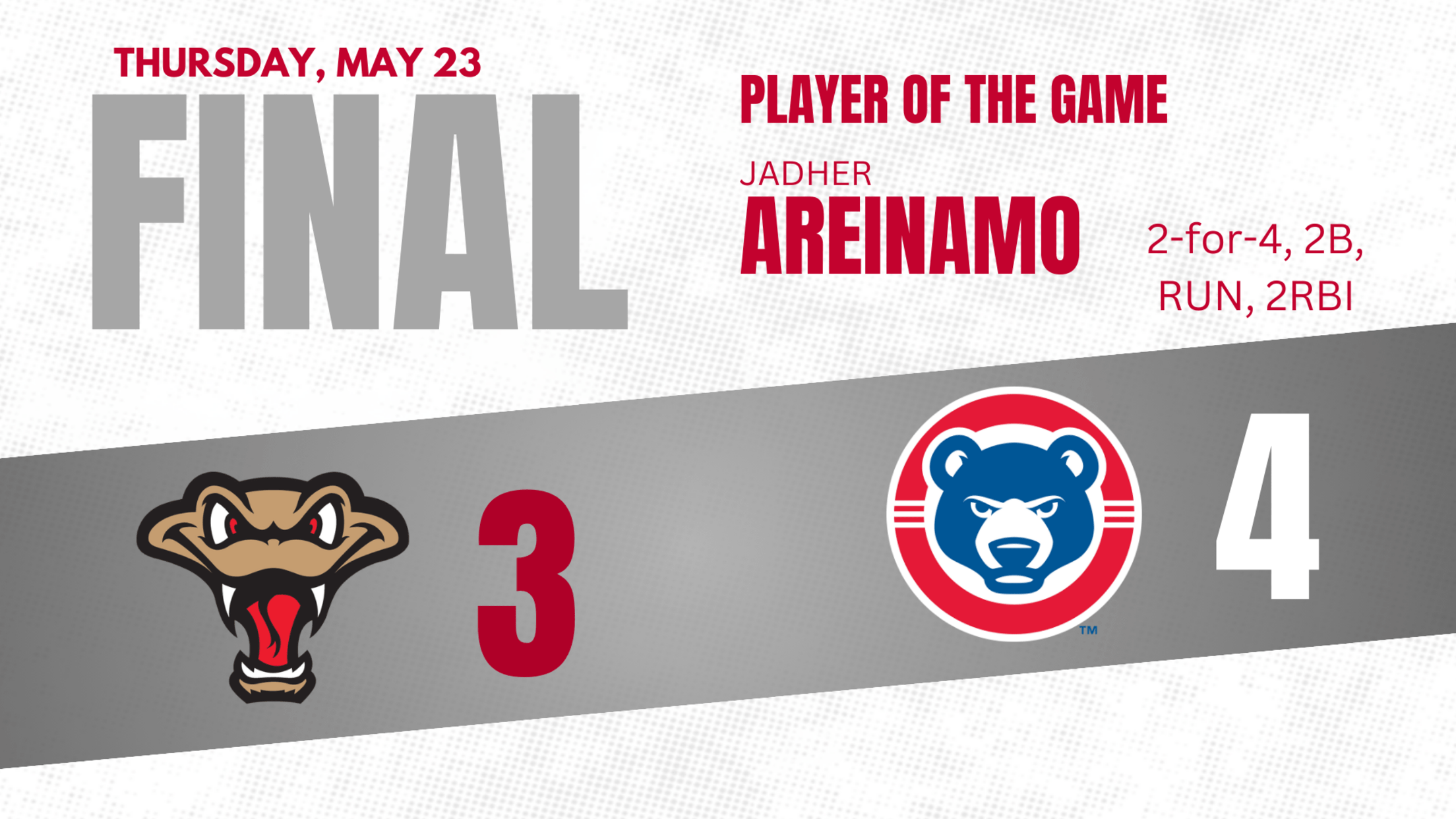 The Rattlers didn’t stop trying to comeback in the eighth. Gregory Barrios and Dylan O’Rae both singled to keep the inning alive. Then, Areinamo lined a double to the wall in left to score both runners to pull Wisconsin to within a run.
