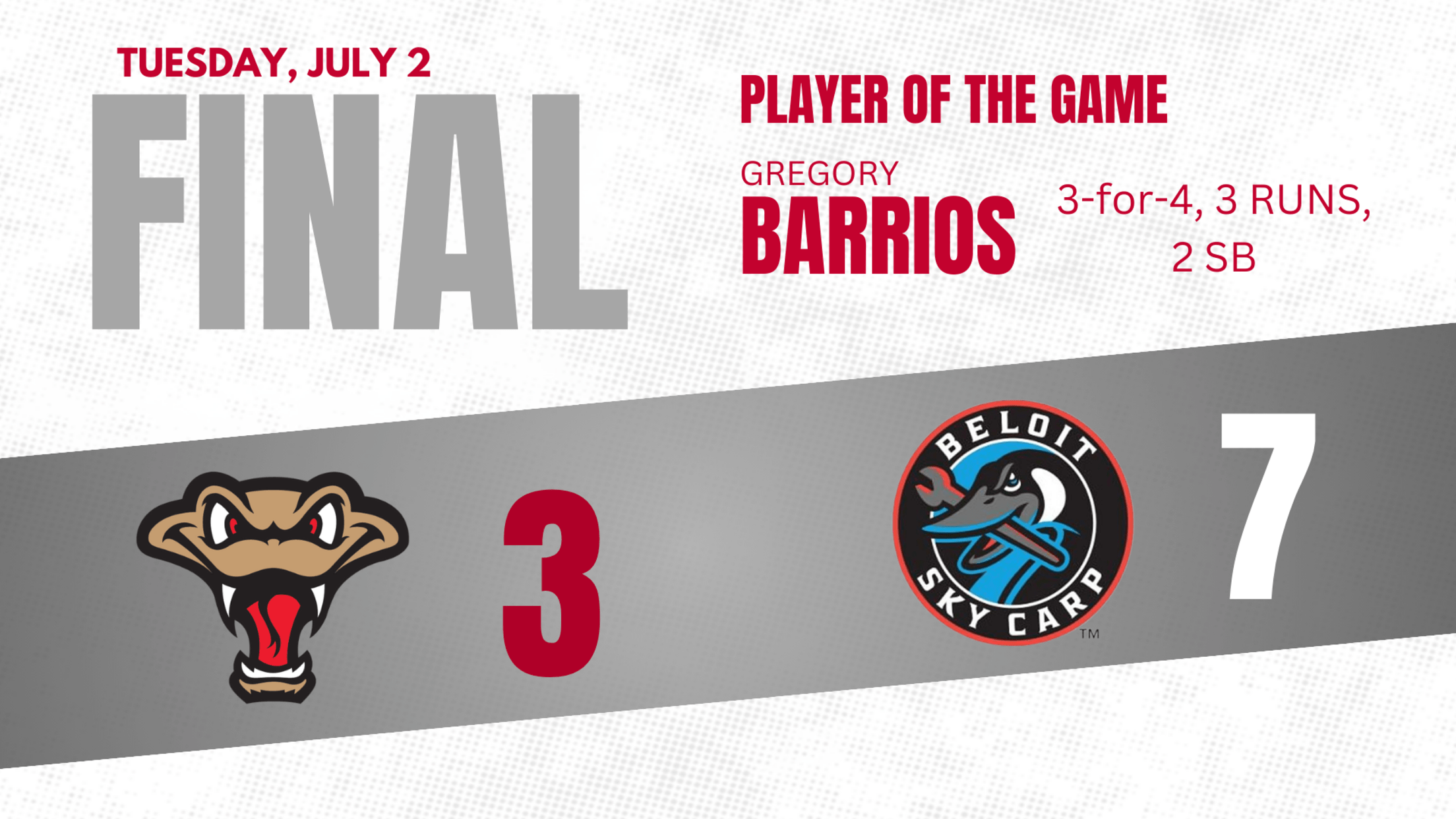 BELOIT, WI – The Wisconsin Timber Rattlers dropped a rain-shortened game to the Beloit Sky Carp Tuesday night at ABC Supply Stadium. Beloit plated their last five runs of the game on three different two-out singles to defeat Wisconsin 7-3.