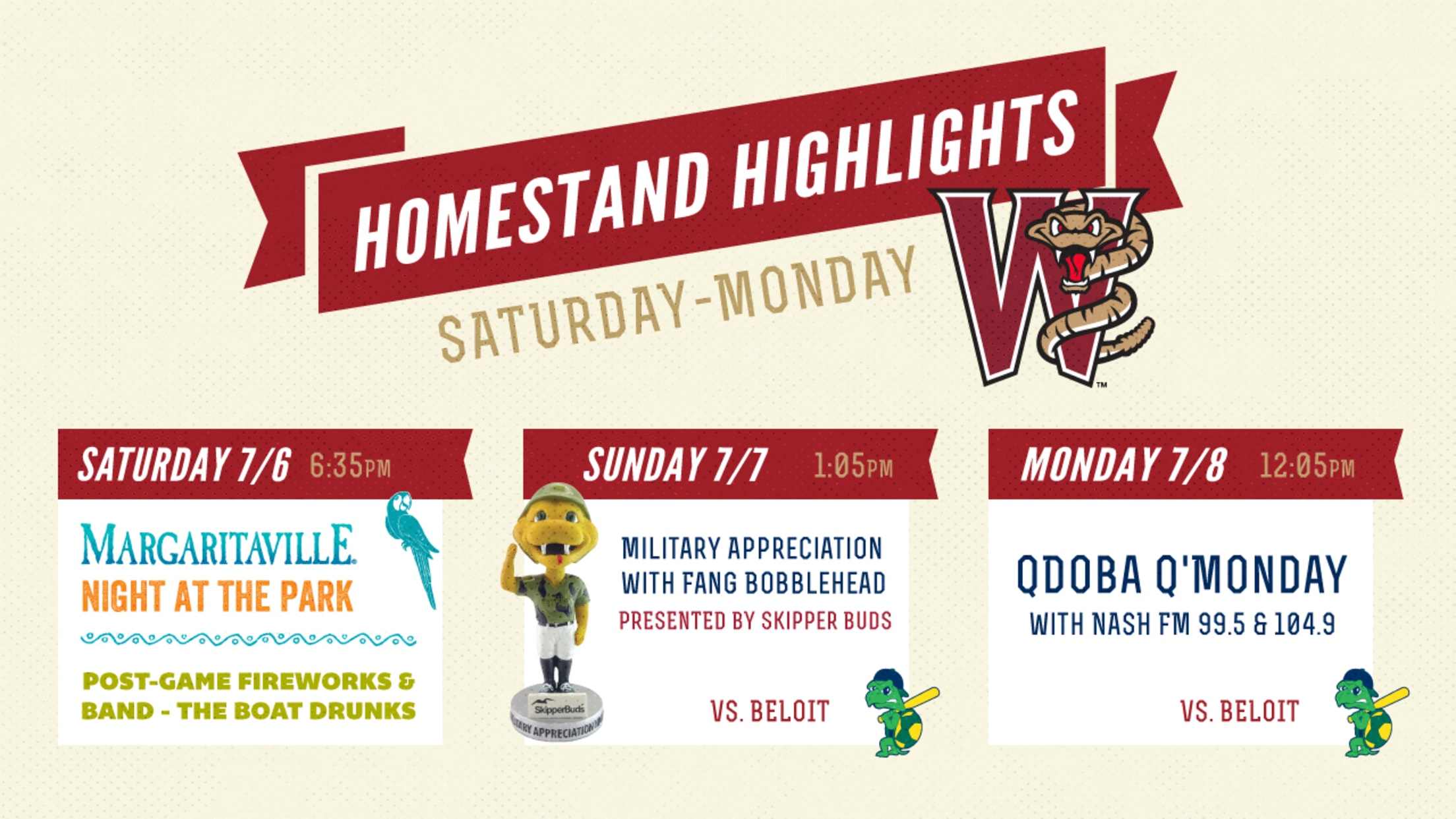 GRAND CHUTE, WI - The Wisconsin Timber Rattlers have a brief road trip to Kane County for July 4 and July 5 before returning to Neuroscience Group Field at Fox Cities Stadium for three games against the Beloit Snappers from July 6 through July 8. These three home games start with changes in latitudes, include a military appreciation game, and end with day baseball