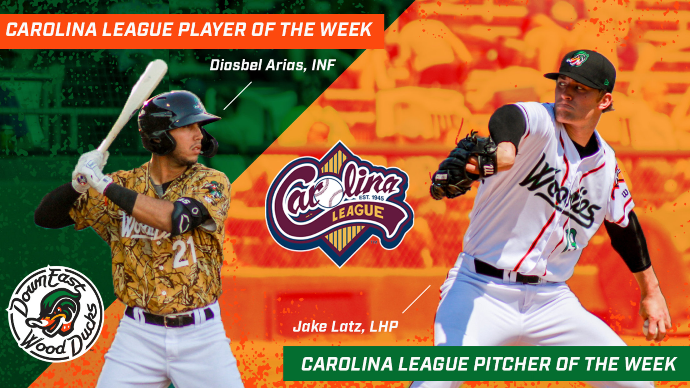 Kinston, N.C. - Following a week in which the Wood Ducks went 5-1 as a team, they also had two players recognized individually, with Diosbel Arias being named Player of the Week, and Jake Latz taking home Pitcher of the Week honors, the Carolina League announced today.