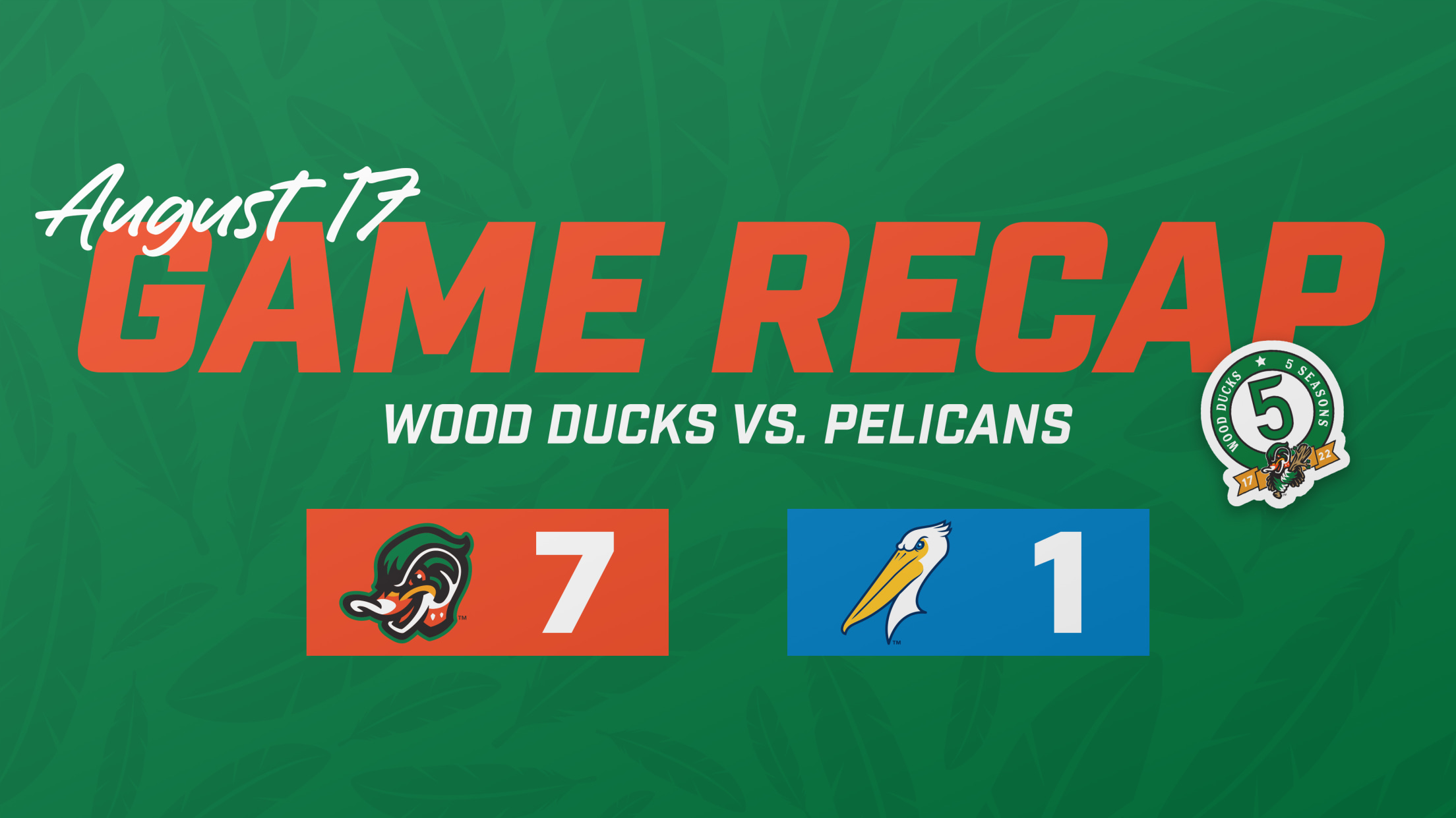 The Pelicans were looking for a comeback down 2-0 going into the later stages of the game and they put up one run in the top of the seventh with two walks starting the inning off, before a double down the left field line by Ethan Hearn scored Ballesteros from second. The Wood Ducks responded with two more runs in the bottom half with Mateo reaching on a walk, stealing second for his 39th bag of the season, and Yosy Galan delivering a two run blast to extend the lead to 4-1.