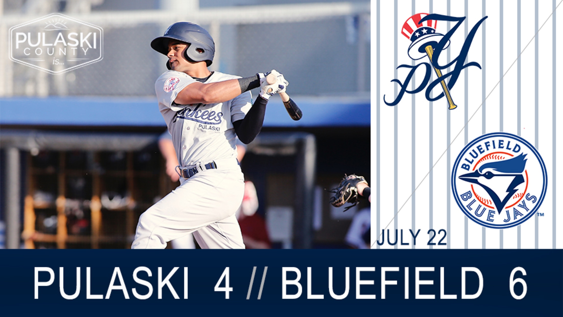 BLUEFIELD, Va. - In a game that saw a one hour, 45 minute rain delay in the first inning, the Pulaski Yankees found themselves on the wrong end of late-inning scoring to drop game two against Bluefield by a 6-4 final score Sunday night. For the second consecutive night, the Blue Jays tallied two runs in the home half of the eighth inning that would prove to be the difference in the contest.