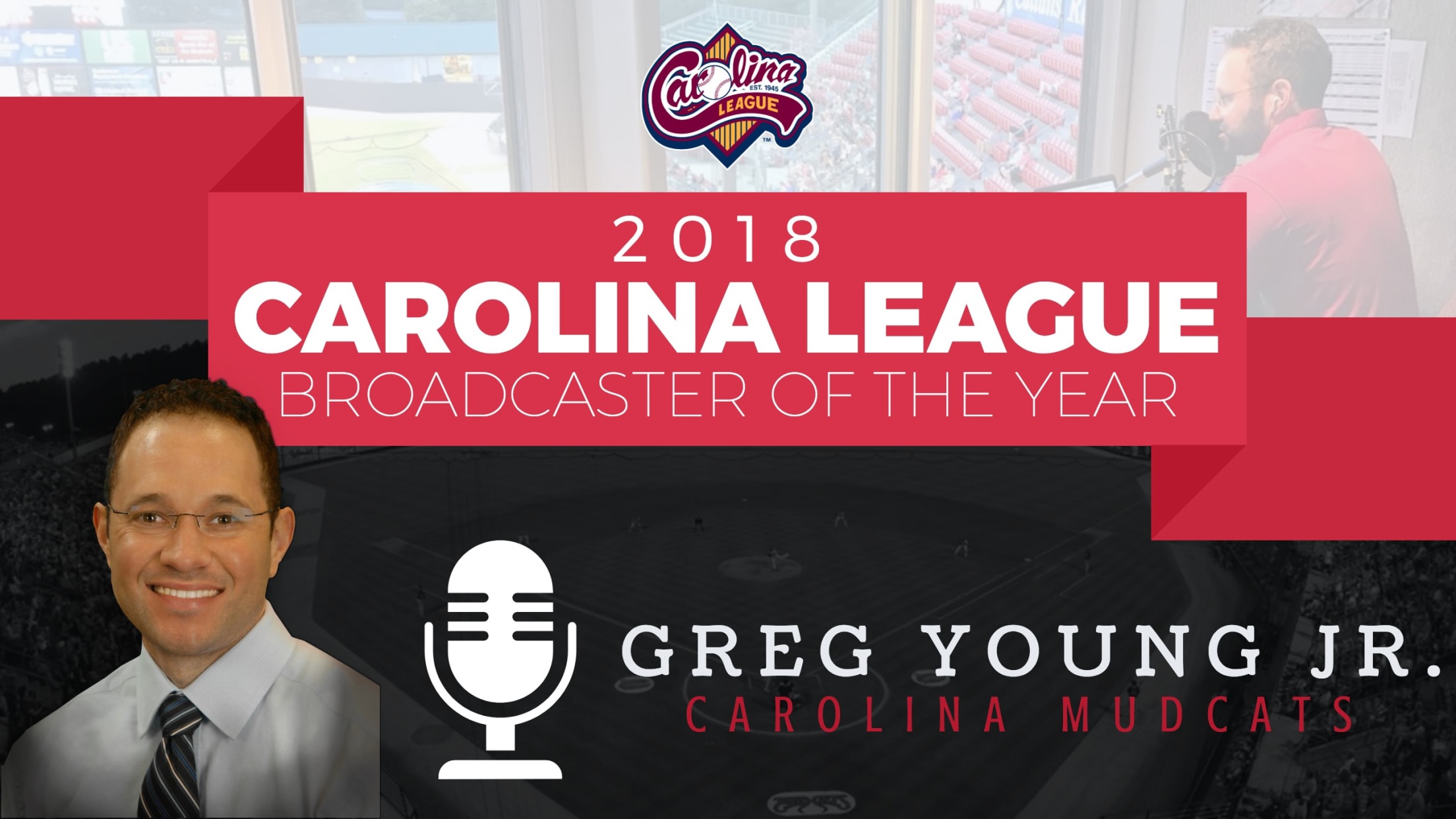 ZEBULON, N.C. (August 31, 2018) - Greg Young, the play-by-play broadcaster for the Carolina Mudcats, has won the seventh annual Carolina League Broadcaster of the Year award. Young garnered the most votes in a poll among the league's broadcasters.