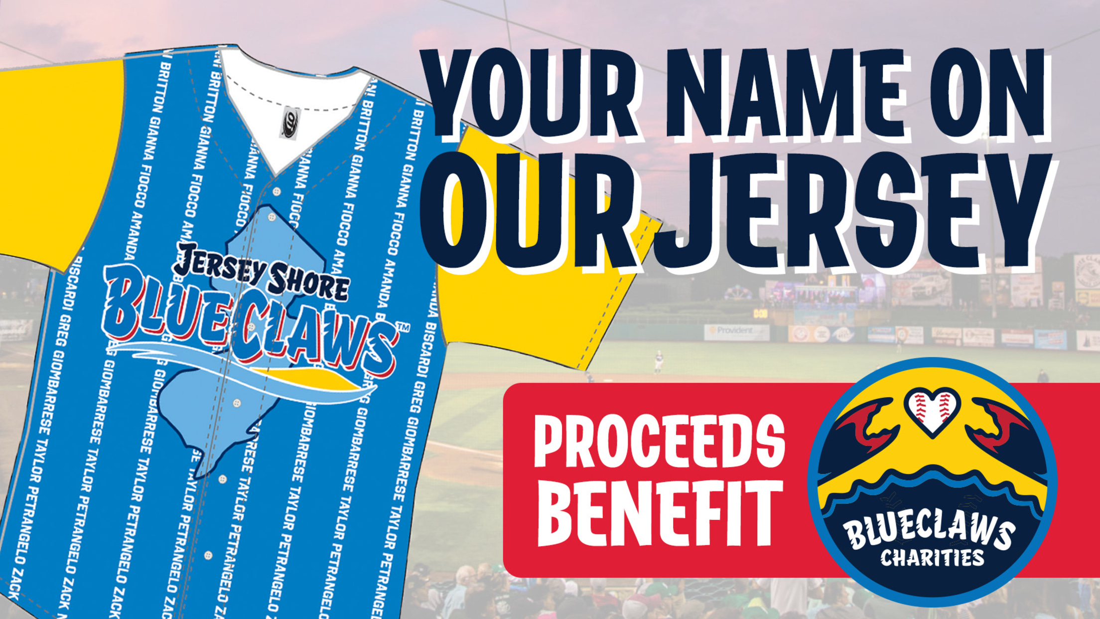 JERSEY SHORE, NJ - Your name can be a part of our 2024 BlueClaws Fan Appreciation Night Jersey, to be worn by the team on Saturday, August 31st! Plus, in the process, you'll be supporting BlueClaws Charities and our Community Partners.