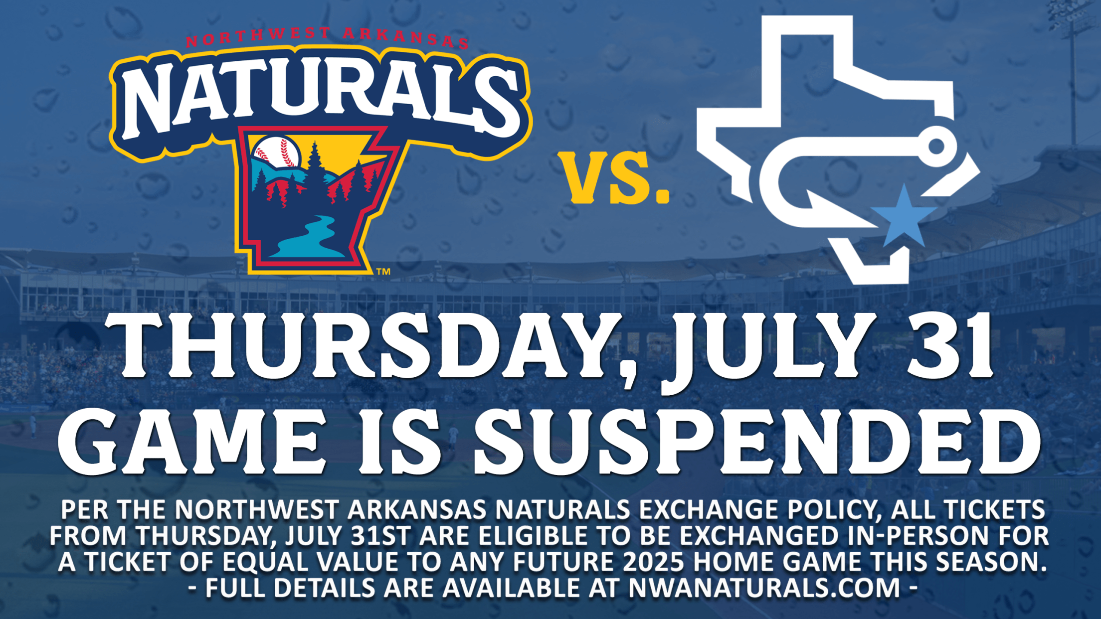All tickets from Thursday, July 31st are eligible, per the Naturals’ official weather policy, to be exchanged in-person at the Arvest Ballpark Box Office for a ticket of equal value, based on availability, to any regular season home game during the 2025 season. Tickets for Friday, August 1st are now good for both the suspended game and the regularly scheduled game.