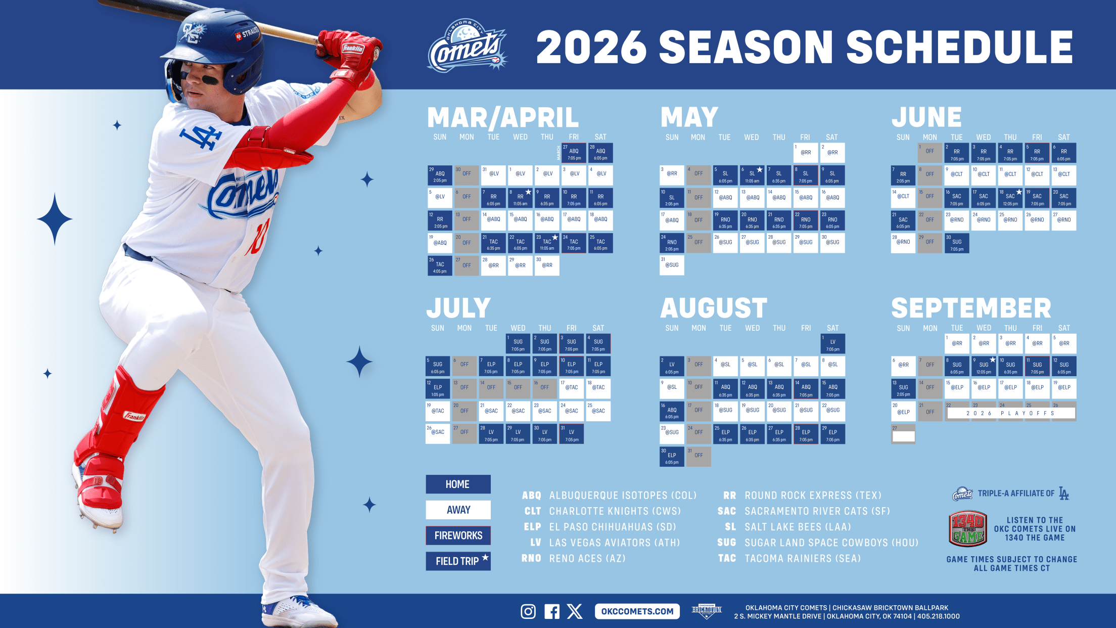 OKLAHOMA CITY – The Oklahoma City Comets have released their 2026 schedule, complete with dates, times and opponents for all 75 home games at Chickasaw Bricktown Ballpark. The Triple-A affiliate of the back-to-back World Champion Los Angeles Dodgers will open the 2026 season at 7:05 p.m. Friday, March 27 against
