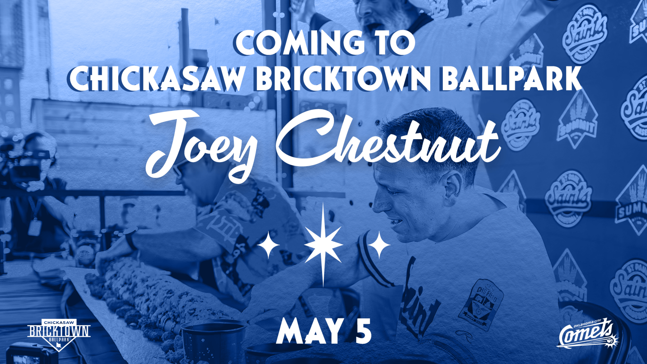 OKLAHOMA CITY – Legendary competitive eater Joey Chestnut is scheduled to appear at Chickasaw Bricktown Ballpark during the Oklahoma City Comets game Tuesday, May 5. The Comets are one of several clubs on the Diamond Baseball Holdings roster welcoming Chestnut to their lineup of family-friendly ballpark experiences this season.