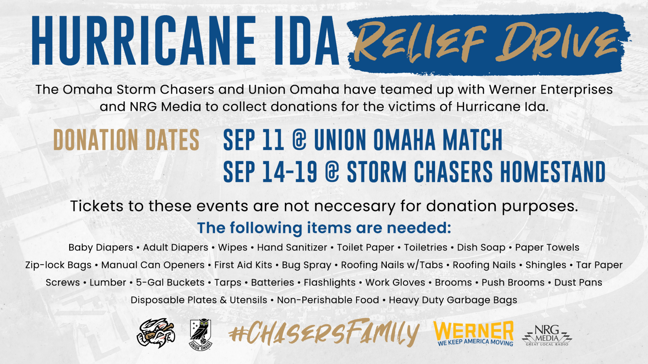 The Omaha Storm Chasers and Union Omaha announced today the launch of the Hurricane Ida Relief Drive which will collect essential items to be distributed to those affected by Hurricane Ida. The drive is set to begin on Saturday, September 11 at the Union Omaha soccer match at Werner Park