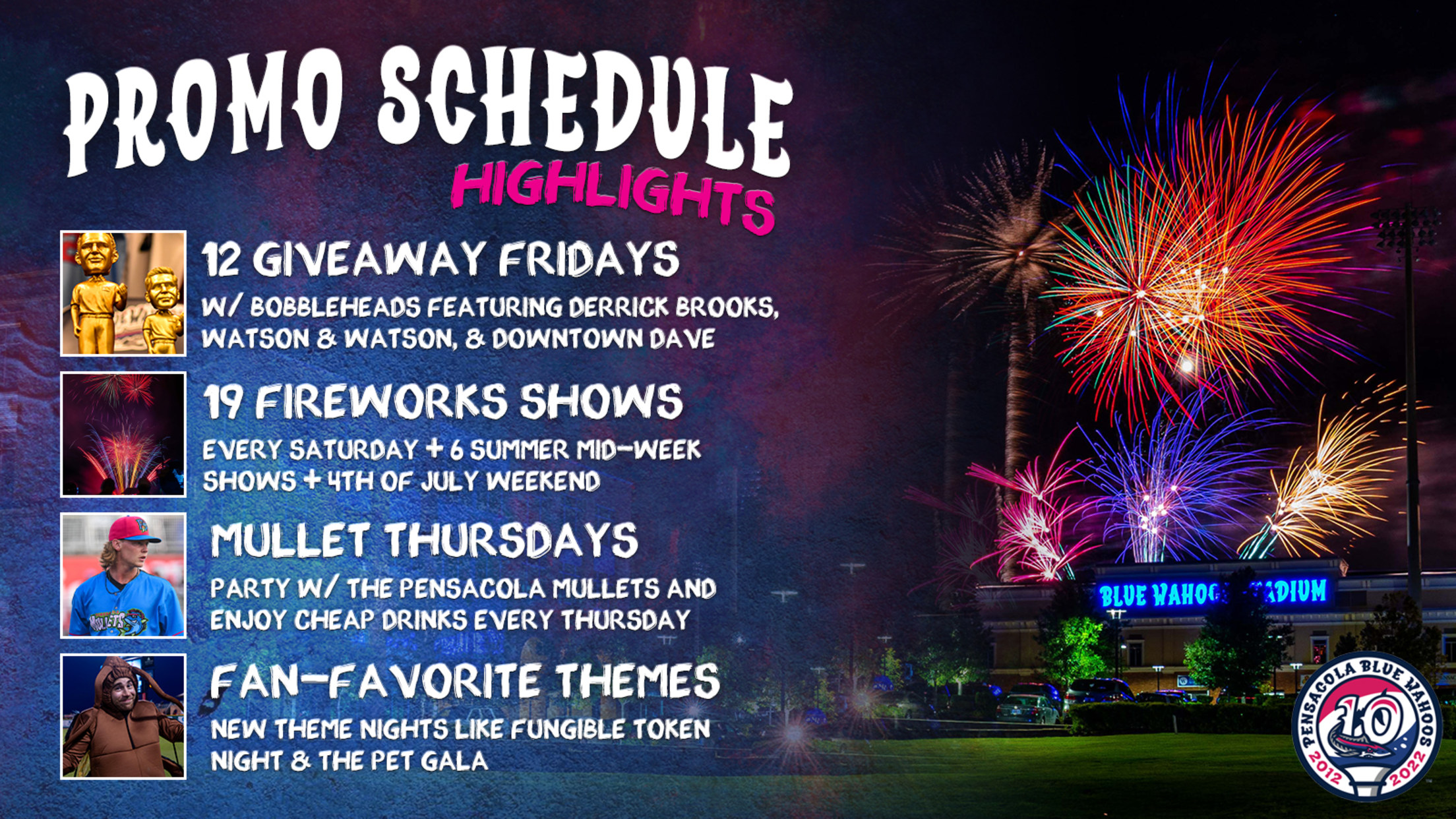 Click To View The Full Promo Schedule In celebration of their tenth season on the bay, the Pensacola Blue Wahoos are excited to announce a jam-packed promotional schedule for the 2022 campaign full of daily promotions, giveaways, specialty jerseys and one-of-a-kind theme nights! Daily Promotions With the return of six-game