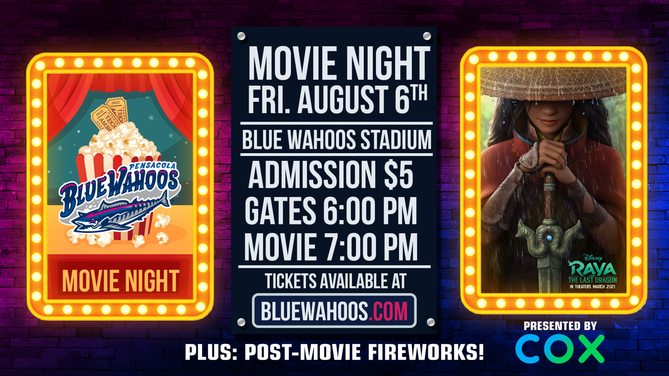 GET TICKETS Celebrate the start of a new school year with a Movie & Fireworks Night at Blue Wahoos Stadium thanks to COX Communications! Catch Disney's Raya And The Last Dragon on Friday, August 6th at Blue Wahoos Stadium with post-movie fireworks! Tickets are just $5 and are available now