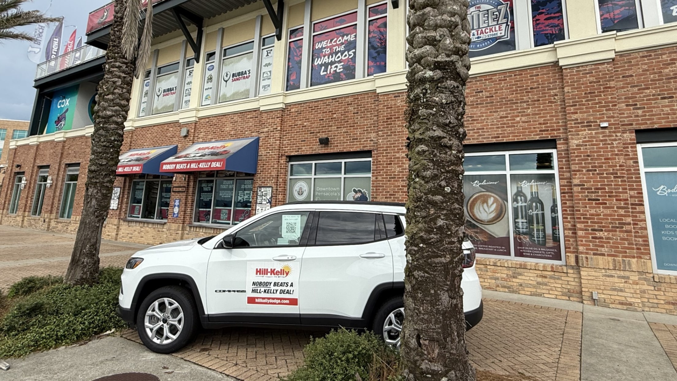 The new vehicle, a 2025 Jeep Compass Latitude, valued around $27,000 (based on current MSRP), is parked out front of the stadium.