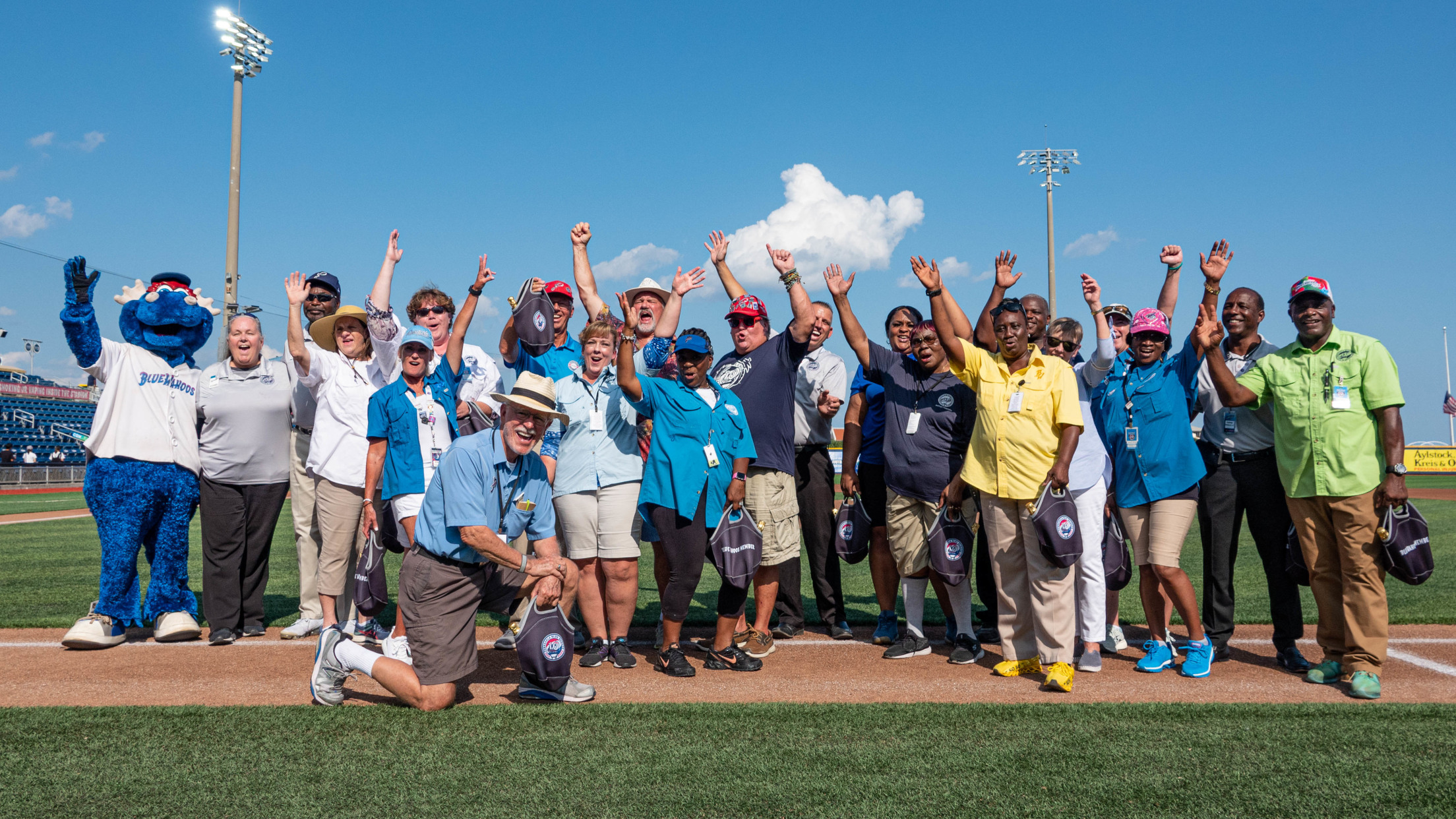 Blue Wahoos seasonal employees were honored for 10-year service during 2022 season. There are position openings for 2024 season available during job fair on Feb. 12-13. (Nino Mendez/Pensacola Blue Wahoos)