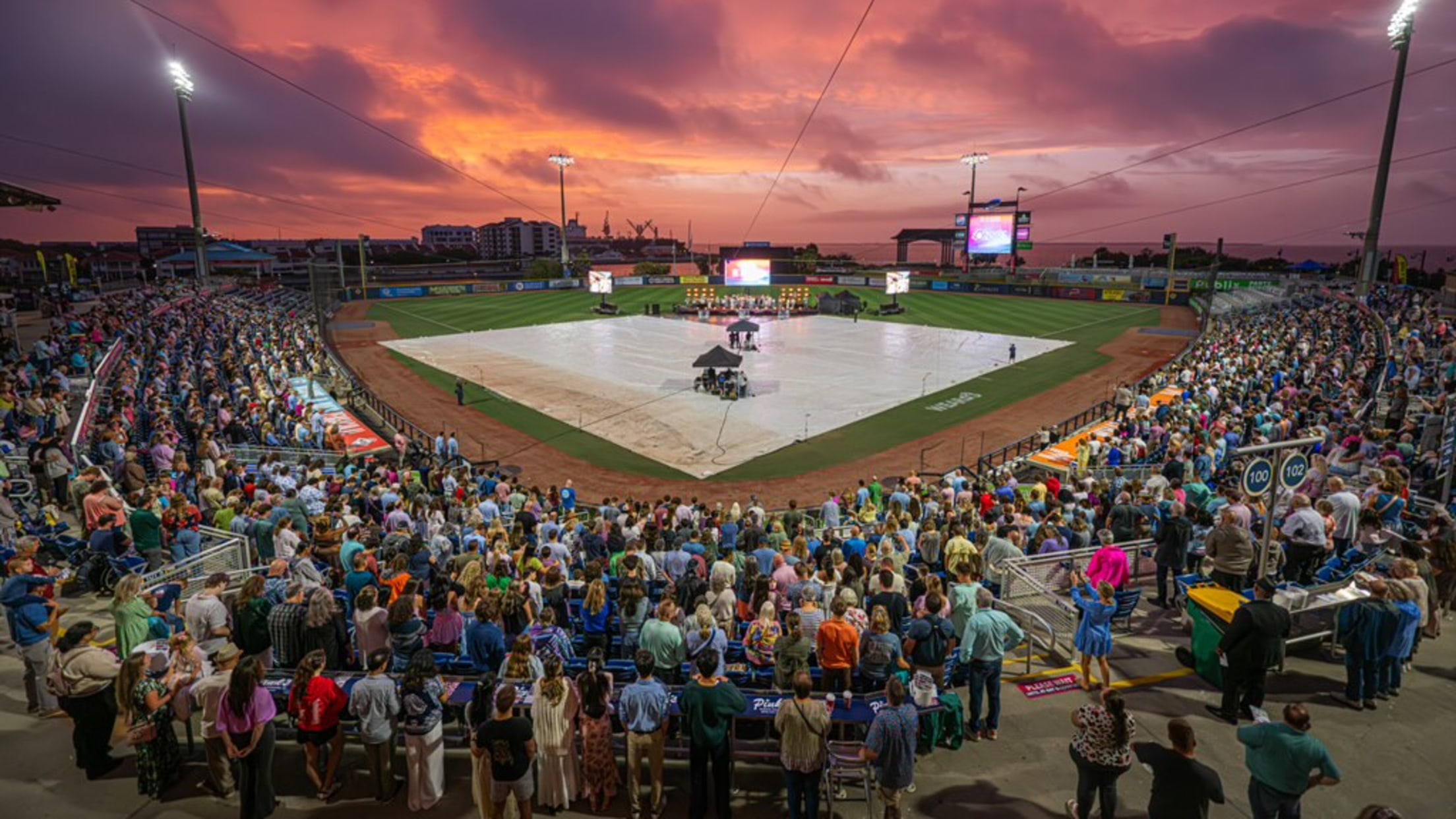 The predawn darkness on Easter Sunday gave way to a burst of orange, as a sunrise briefly pierced through rain clouds above Pensacola Bay and Blue Wahoos Stadium.