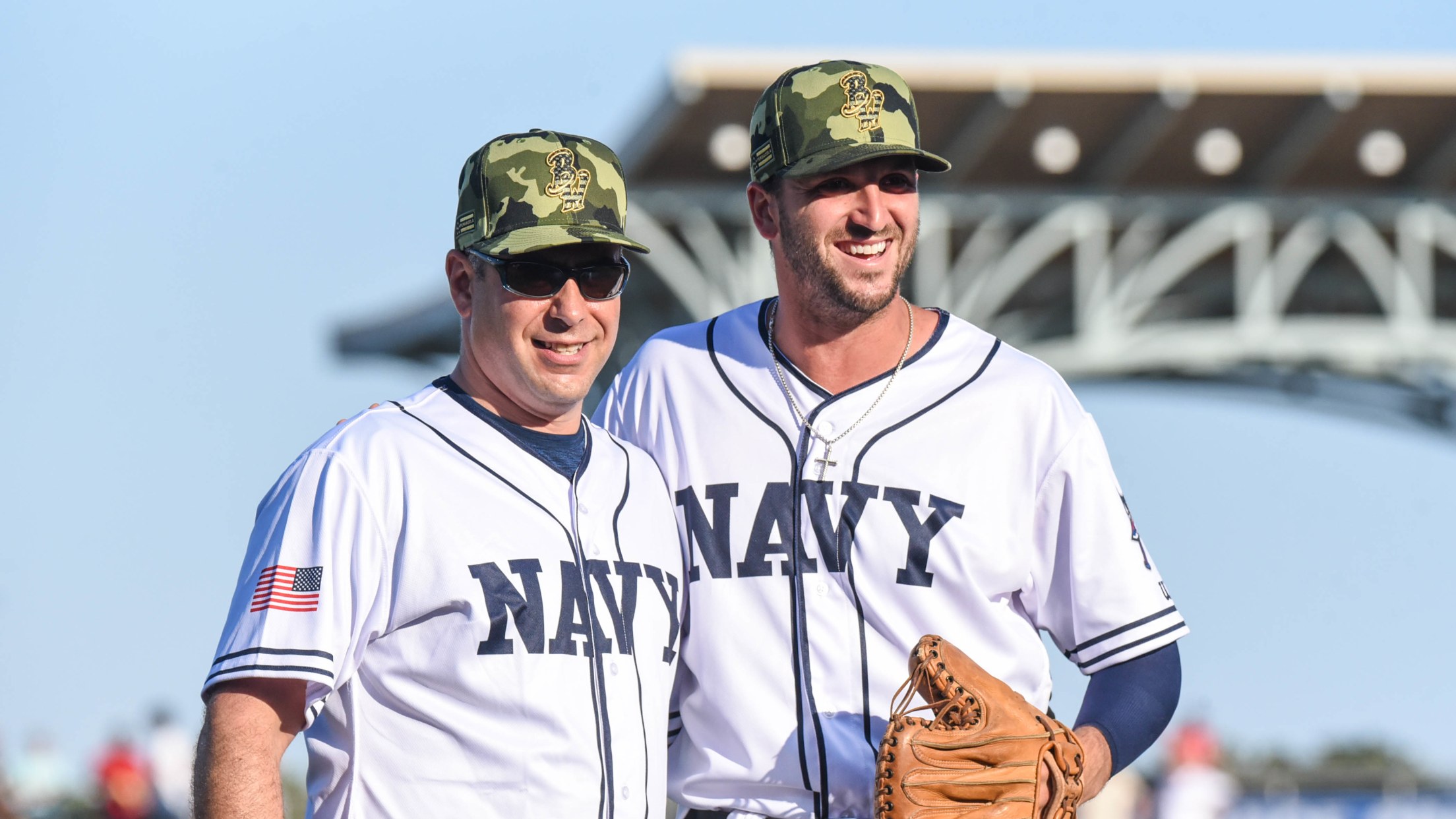 The players wore blue-white striped uniforms with Navy on the front jersey, similar to those worn by MLB players who played on base all-star teams during a break from training for World War II.