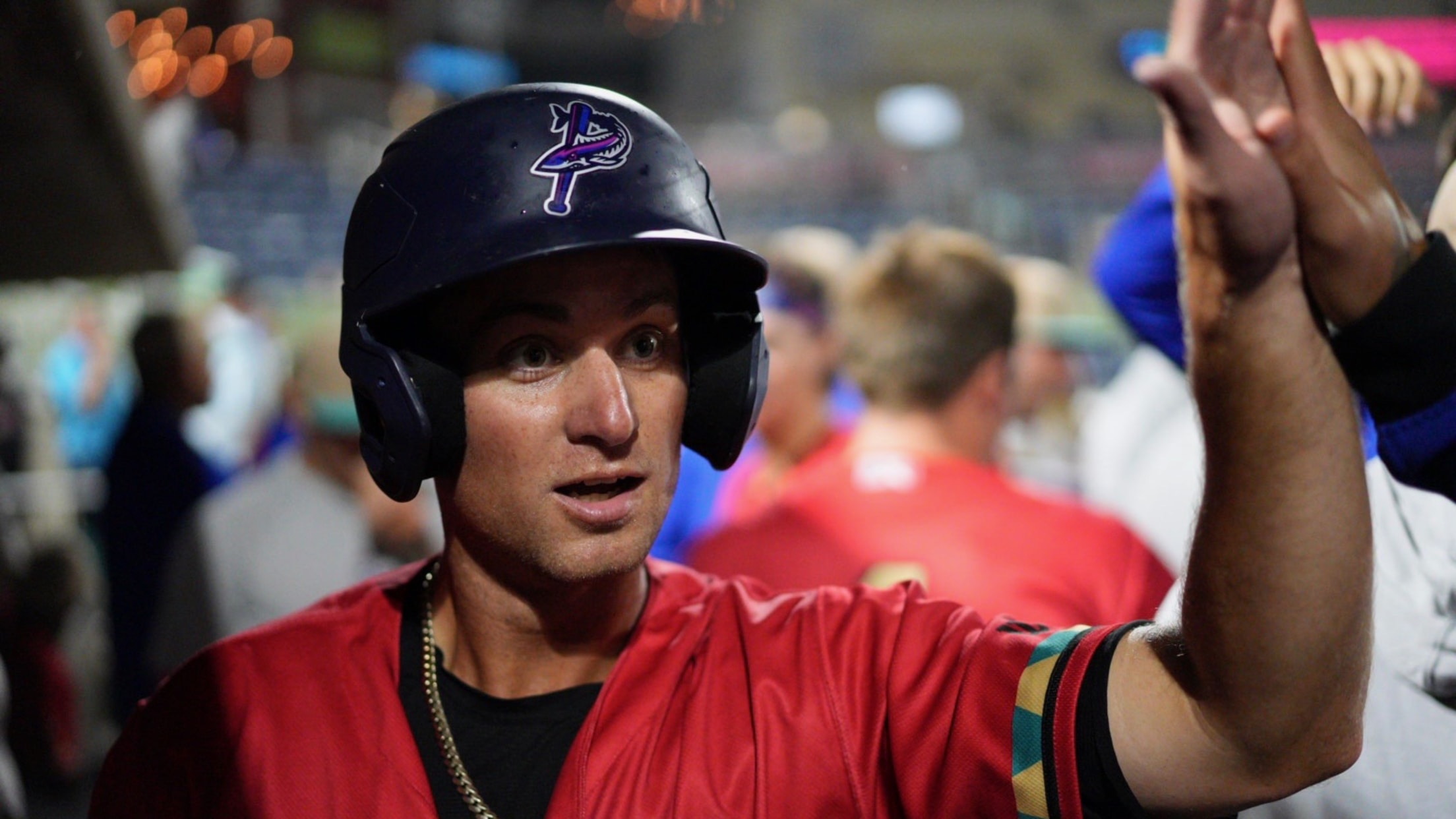 Pensacola LF Jake Thompson greets teammates in the dugout after scoring the tying run in the 9th inning. (Nino Mendez/Pensacola Blue Wahoos)