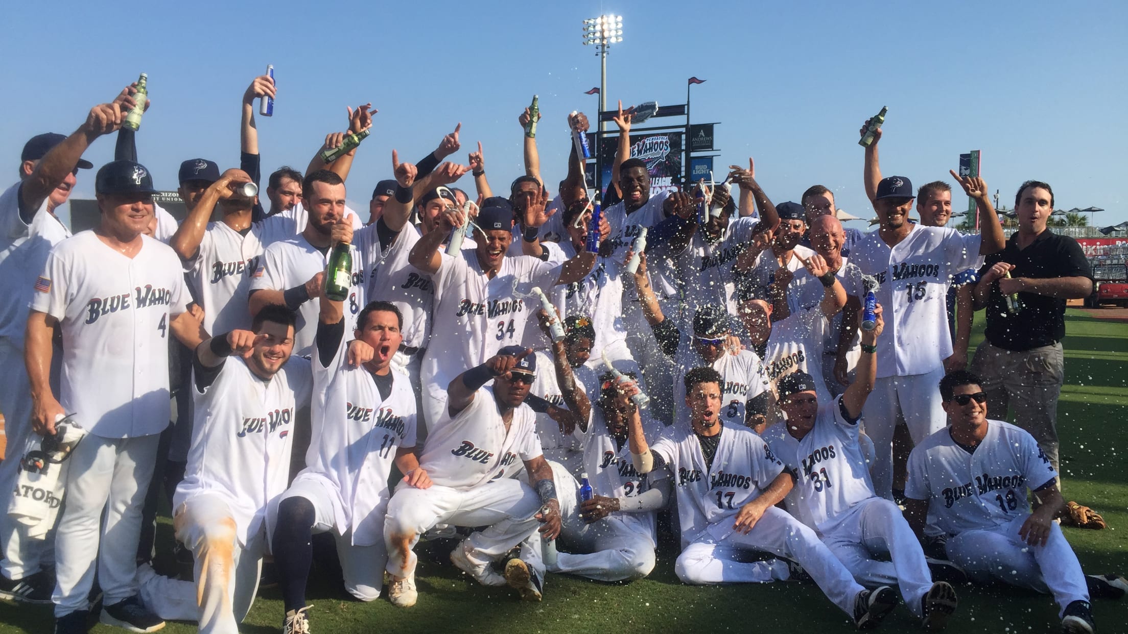 The players sprinted out to the mound and then all took a knee. After a moment of calm, pandemonium broke out. Pensacola manager Pat Kelly got a bucket of ice cold water dumped over his head. Players rubbed hitting coach Gookie Dawkins bald head with alcohol and poured champagne and beer down pitching coach Danny Darwin's back. No one escaped without getting drenched with champagne and beer.