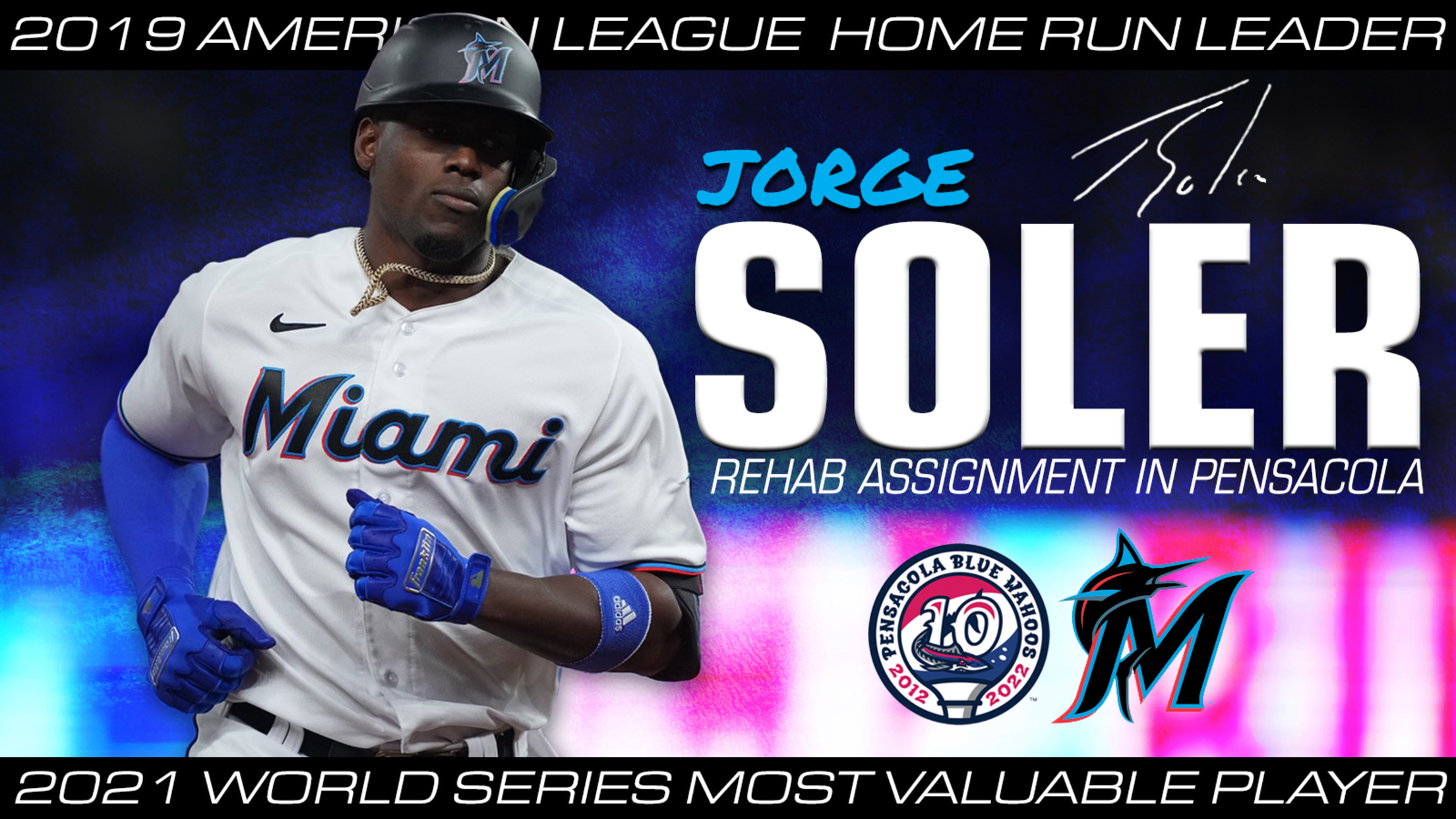 2021 World Series Most Valuable Player Jorge Soler will join the Blue Wahoos roster on Tuesday as he prepares to return to the Miami Marlins lineup from the injured list.