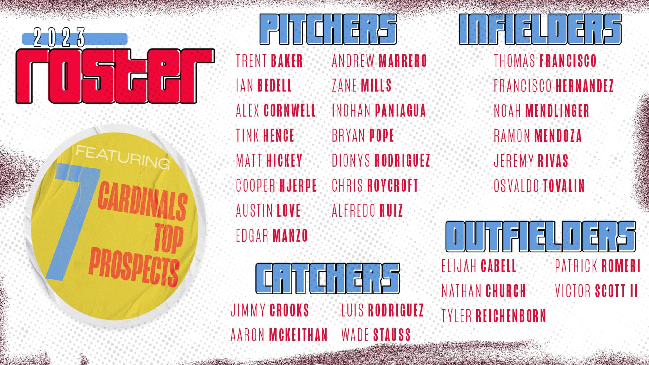 The Chiefs roster is highlighted by pitcher Tink Hence, the Cardinals No. 2 prospect and top pitching prospect in the system. Hence, 20, was named the Florida State League Pitcher of the Year in 2022. Over 52.1 innings with Single-A Palm Beach, Hence punched out 81 batters, good for a 14.0 K/9. Hence is joined by No. 5 prospect and 2022 first-round pick Cooper Hjerpe. In his final season at Oregon State in 2022, Hjerpe led the nation in strikeouts with 161. Other top prospects include pitcher Austin Love (No. 20), catcher Jimmy Crooks (No. 22), pitcher Ian Bedell (No. 26), Zane Mills (No. 27) and Trent Baker (No. 28). Pitching prospect Inohan Paniagua (No. 16) will begin the year on the Injured List.