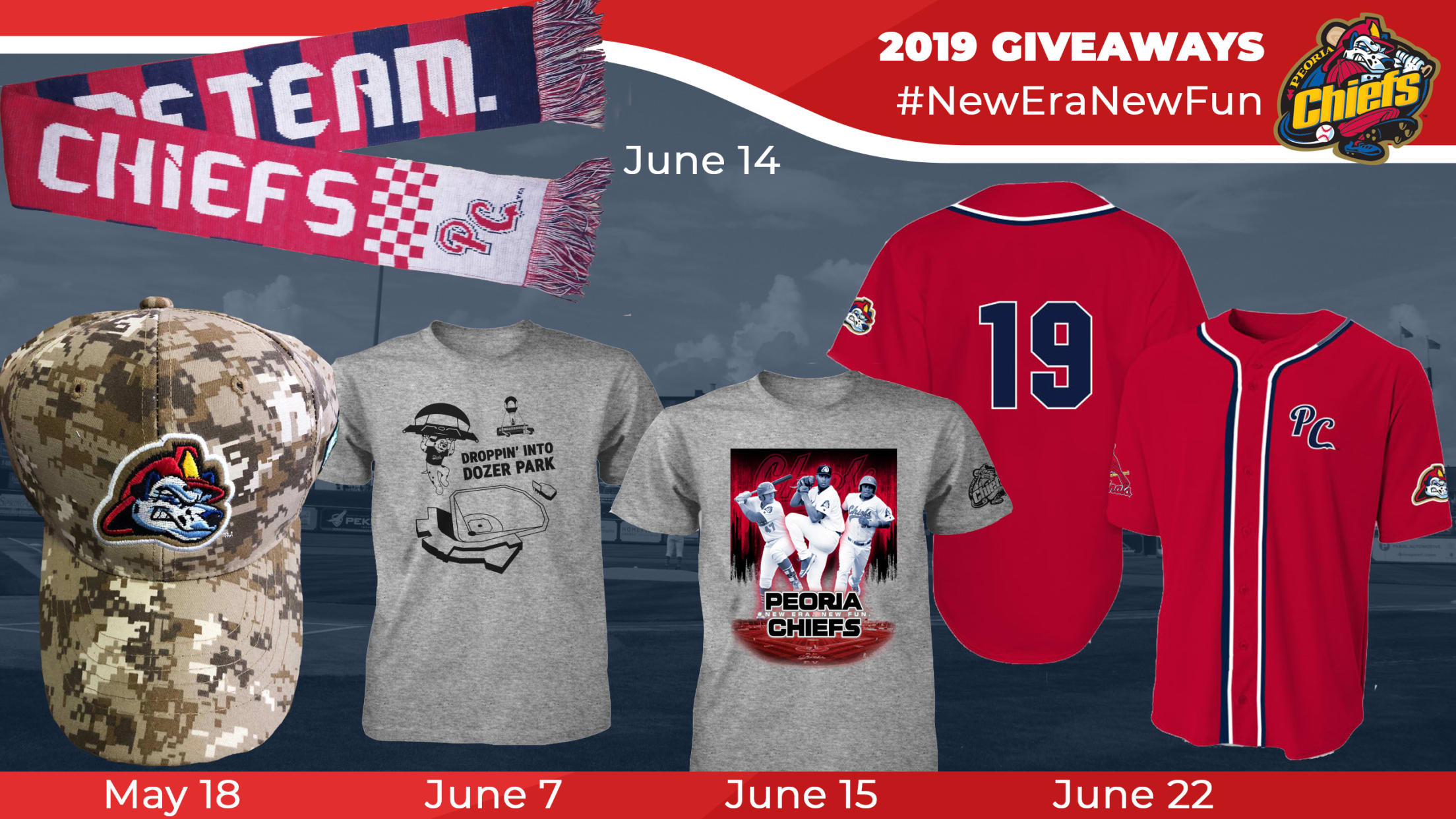 On Armed Forces Day Saturday, May 18, the first 1000 fans 13 and over get a Chiefs camo hat courtesy of Dick's Sporting Goods. The Chiefs will celebrate the 2019 FIFA Women's World Cup on Friday, June 14 and the first 1000 fans 13 and over get a Peoria Chiefs soccer scarf. The next night, June 15, the first 1000 fans 13 and over get an adult Star Wars themed Chiefs t-shirt. The first 1000 fans 13 and over on Saturday, June 22 get an adult Chiefs red alternate replica jersey presented by Hardee's. As requested by many fans on social media, the Chiefs are bring back the bucket hat giveaway for the first time in more than a decade and the first 1000 fans 13 and over get a bucket hat on Saturday, July 13.
