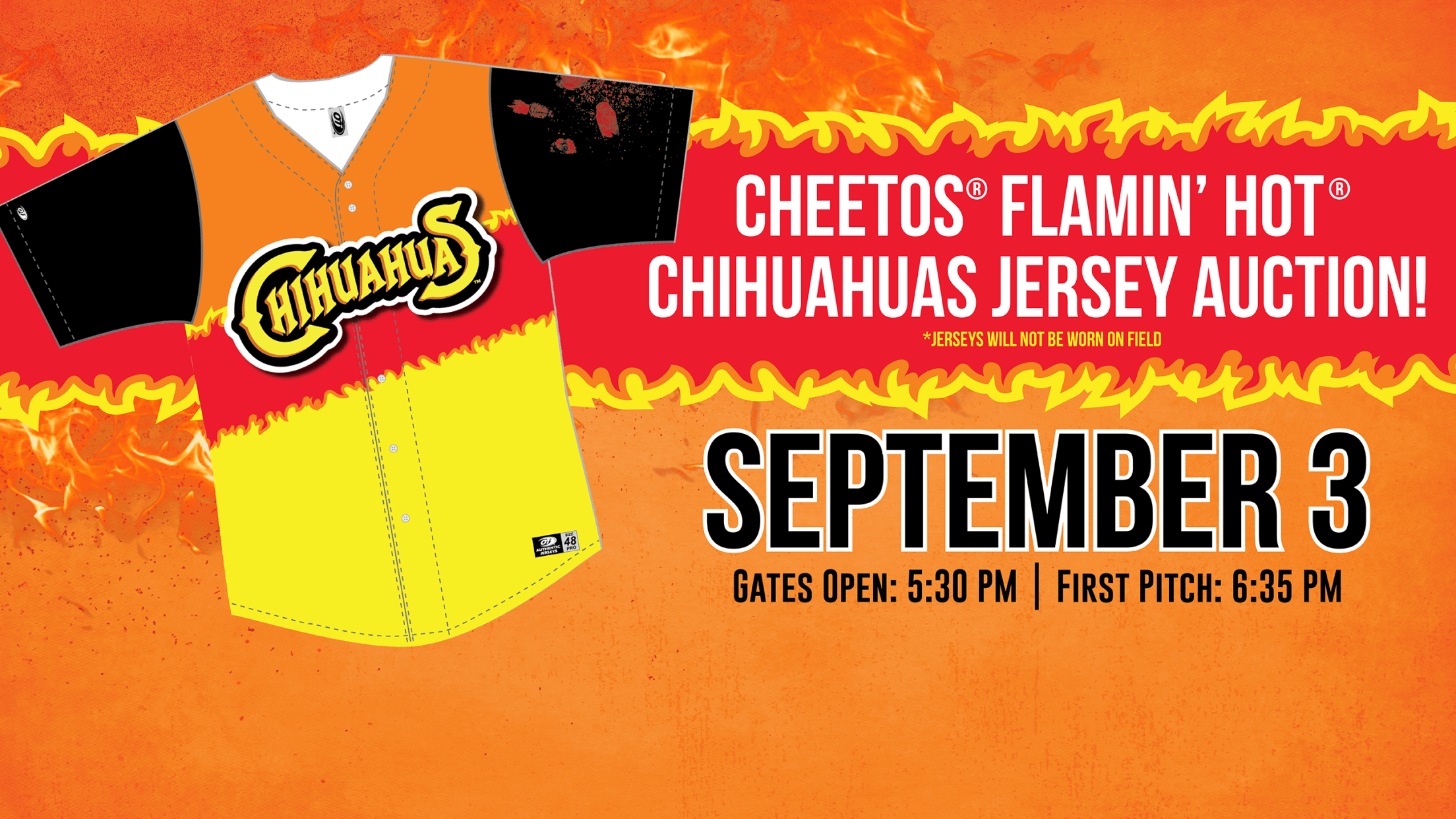 The Chihuahuas will auction the one-of-a-kind limited-edition CHEETOS® Crunchy FLAMIN’ HOT® jerseys starting at 10 a.m. Thurs., September 1. The auction will conclude at the final out of the game on September 3. Proceeds from the auction will benefit El Paso area non-profit organizations. Fans can view the jerseys for auction and participate by texting “BID” to (844) 311-5007. *The jerseys are for auction only and WILL NOT be worn on field. *