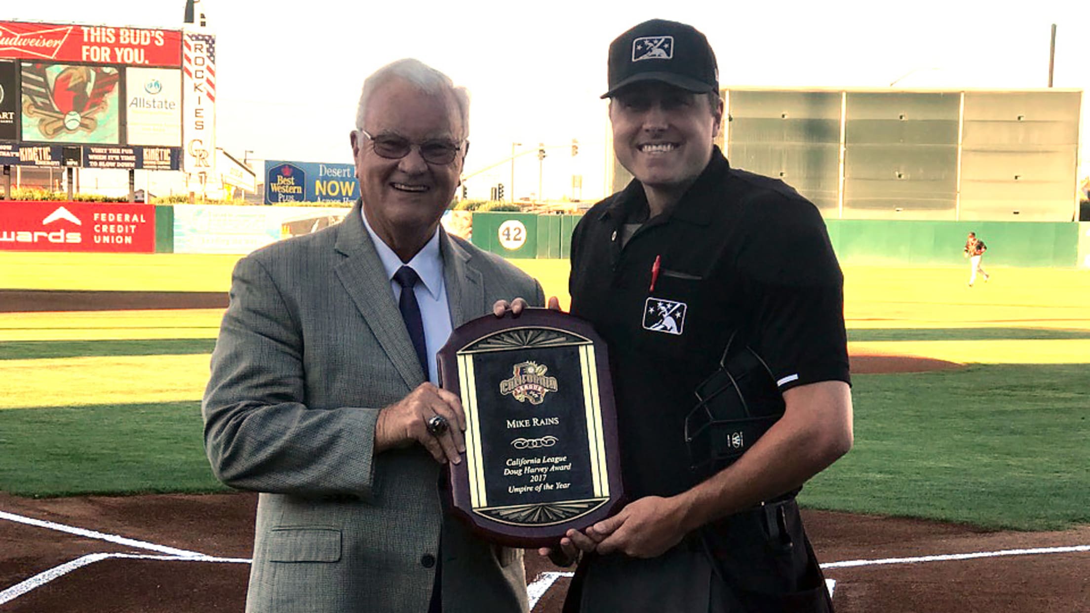 In a pregame ceremony in Lancaster before the start of game one of the Cal League Championship Series, Mike Rains was presented the eighth Doug Harvey Award. Rains is in his fourth season as a Minor League umpire. The 26-year old umpire from Round Rock, Texas was selected as Crew Chief for the Cal League Championships.
