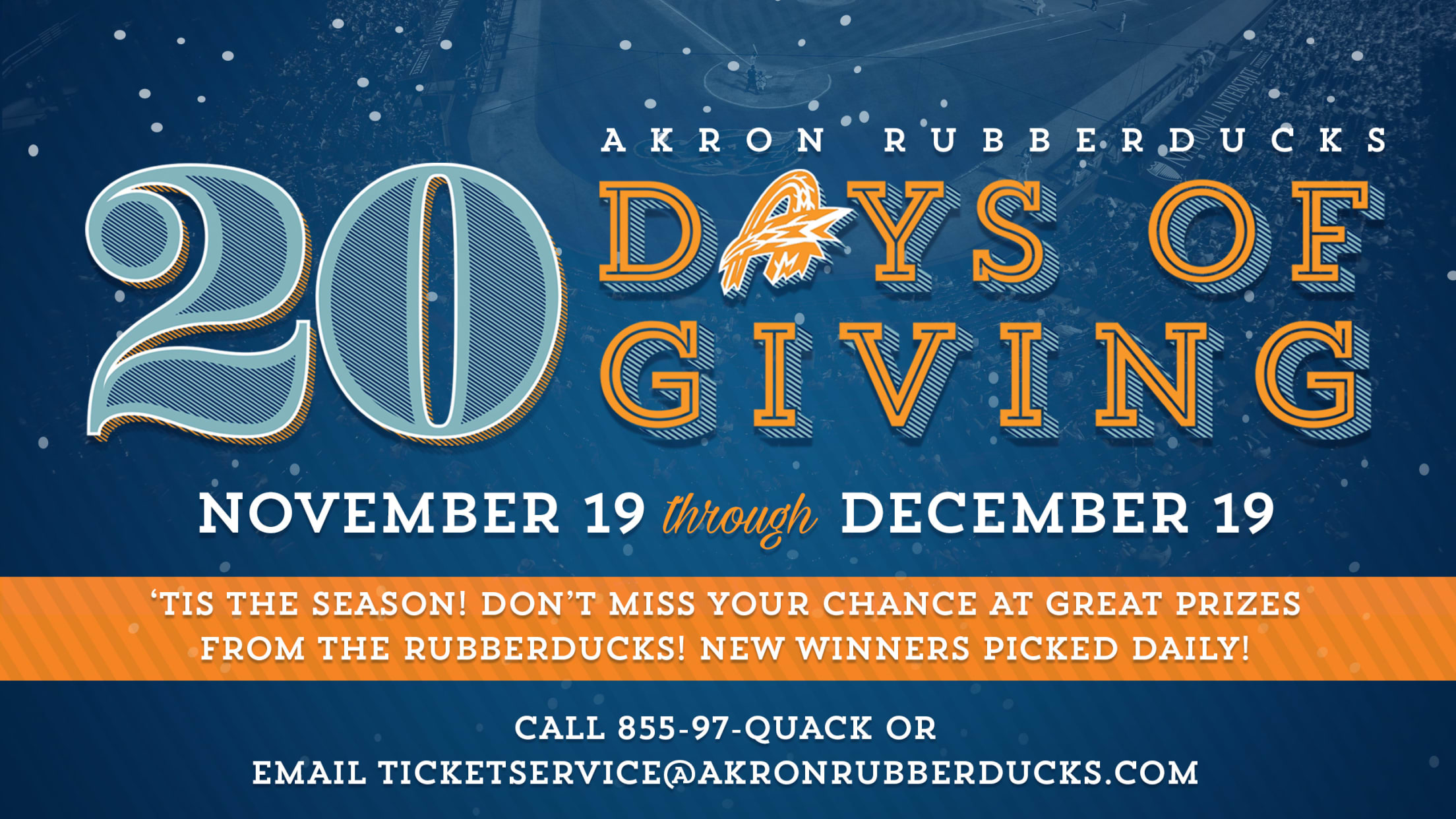 The Akron RubberDucks' annual "20 Days of Giving," begins Tuesday, Nov. 19. The "20 Days of Giving" promotion offers a variety of unique, experience-based prizes which are only available during this once-a-year promotion.