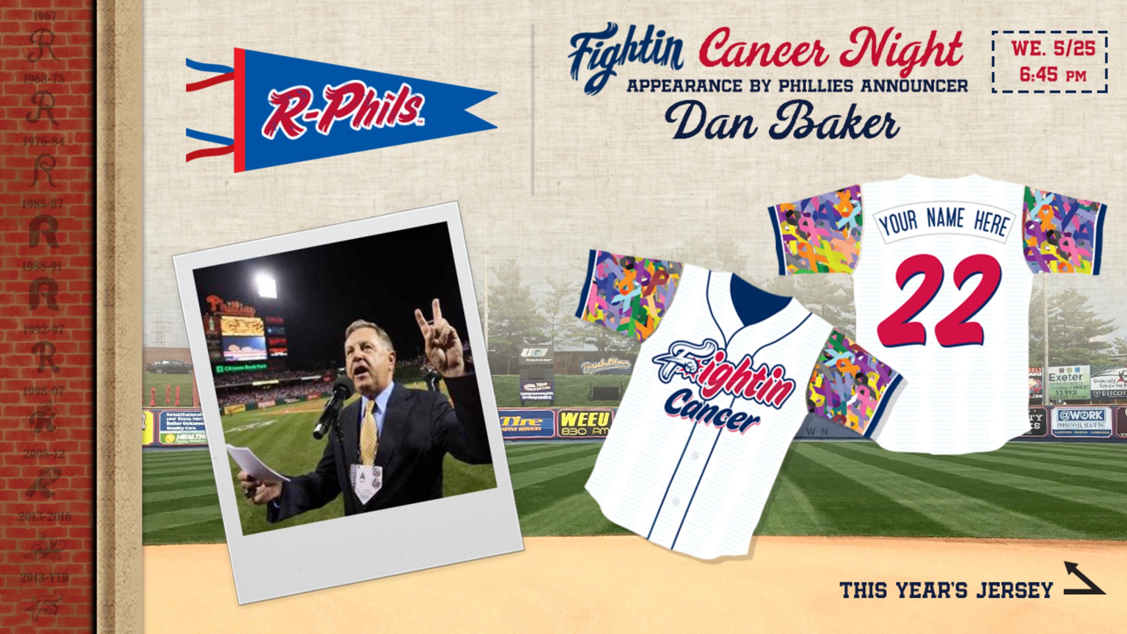 (Reading, PA) – The Reading Fightin Phils are pleased to host ‘Fightin Cancer’ Night at FirstEnergy Stadium on Wednesday, May 25th. The stadium voice of the Phillies and cancer survivor Dan Baker will make an appearance as the R-Phils will honor and support the Darren Daulton Foundation throughout the night. Fans have the opportunity to pay tribute to their own loved ones by participating in the specialty ‘Fightin Cancer’ jersey program.