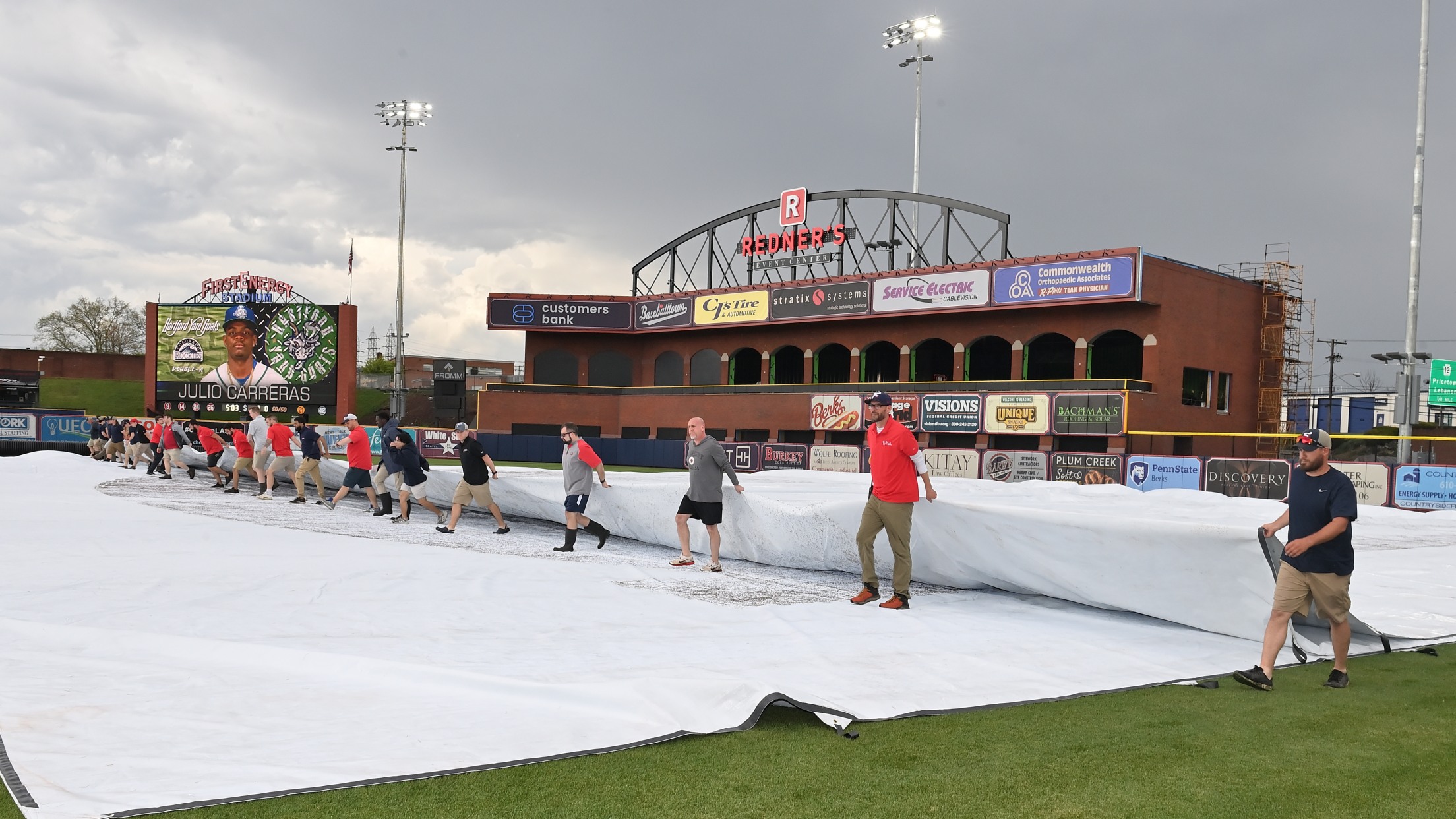 “Ladies and gentlemen, we are sorry. We hoped to play, but with this much rain landing on the field, it’s just not possible to play baseball tonight. Tonight’s Reading Fightin Phils game has been officially postponed due to rain. HOWEVER – WE DO PLAN TO HAVE FIREWORKS! I REPEAT – we do plan to have fireworks. The fireworks crew is still loading the show, and once ready, we expect to have fireworks – likely at approx.. 10PM – which is when fireworks are usually shot after a game anyway. Again – fireworks will take place – thanks to Carpenter & PA Lottery – at approx.. 10PM. Before then, Reggie Brown and Bunch a Funk will entertain us – beginning in a few minutes...