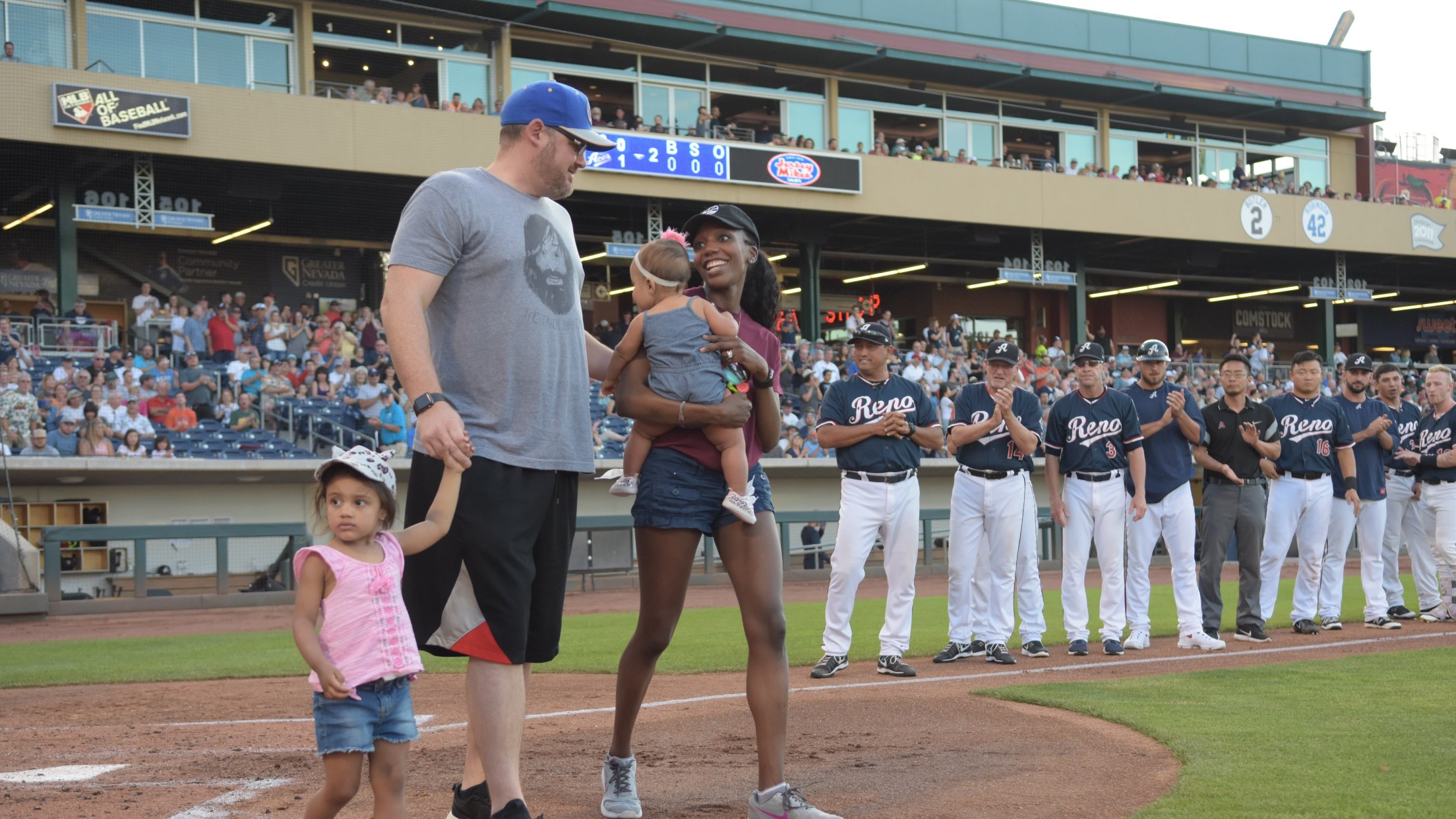 The Reno Aces hosted a Saint Mary's "Home Run for Life" ceremony, featuring Dr. Bayo Curry-Winchell, director of Saint Mary's Urgent Care, and her newborn baby daughter Jaylin, who was born with a rare heart defect.