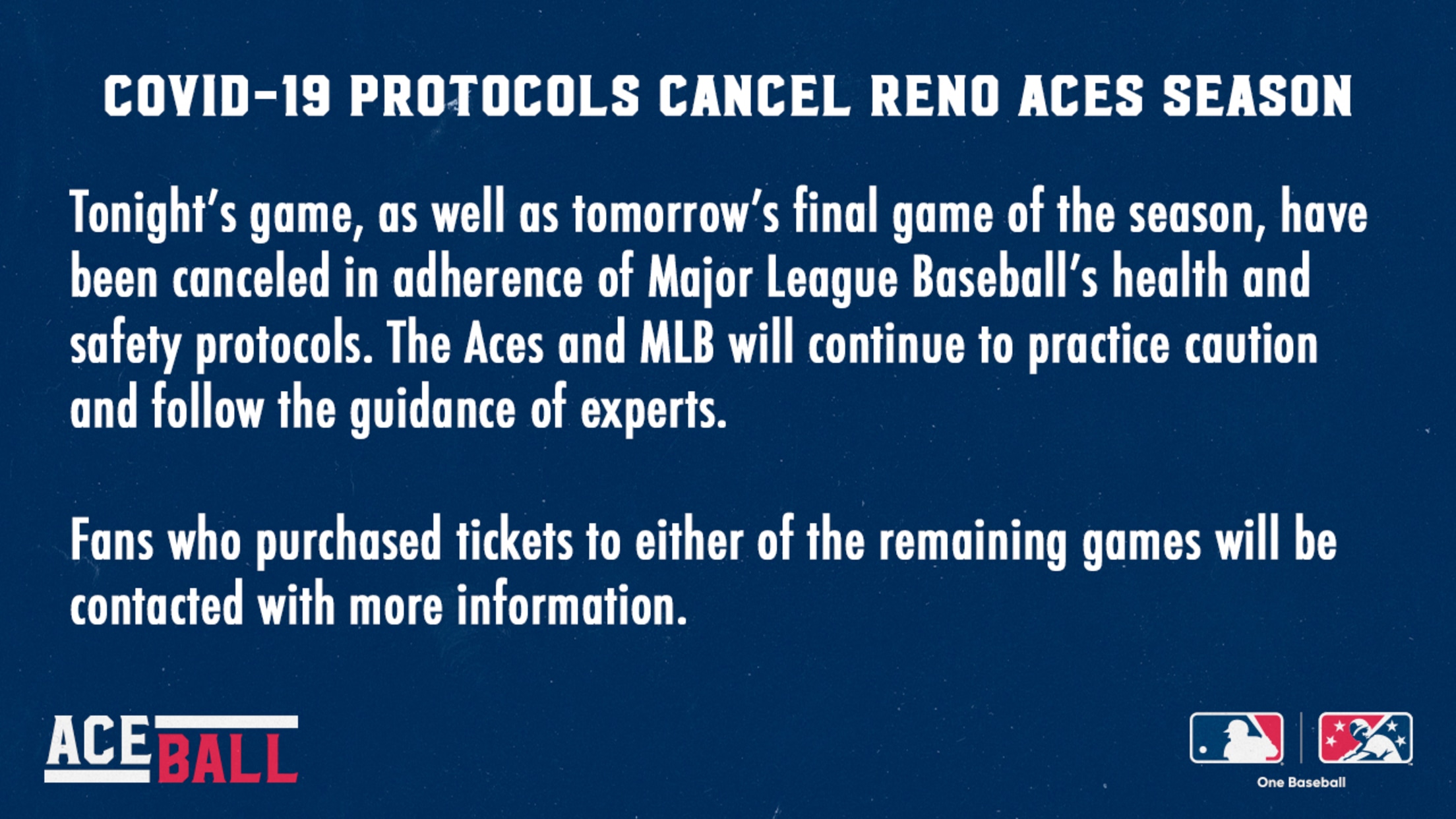RENO, Nev. – Tonight’s game, as well as tomorrow’s final game of the season, have been canceled in adherence of Major League Baseball’s health and safety protocols. The Aces and MLB will continue to practice caution and follow the guidance of experts. The Aces finished the season with a 70-54