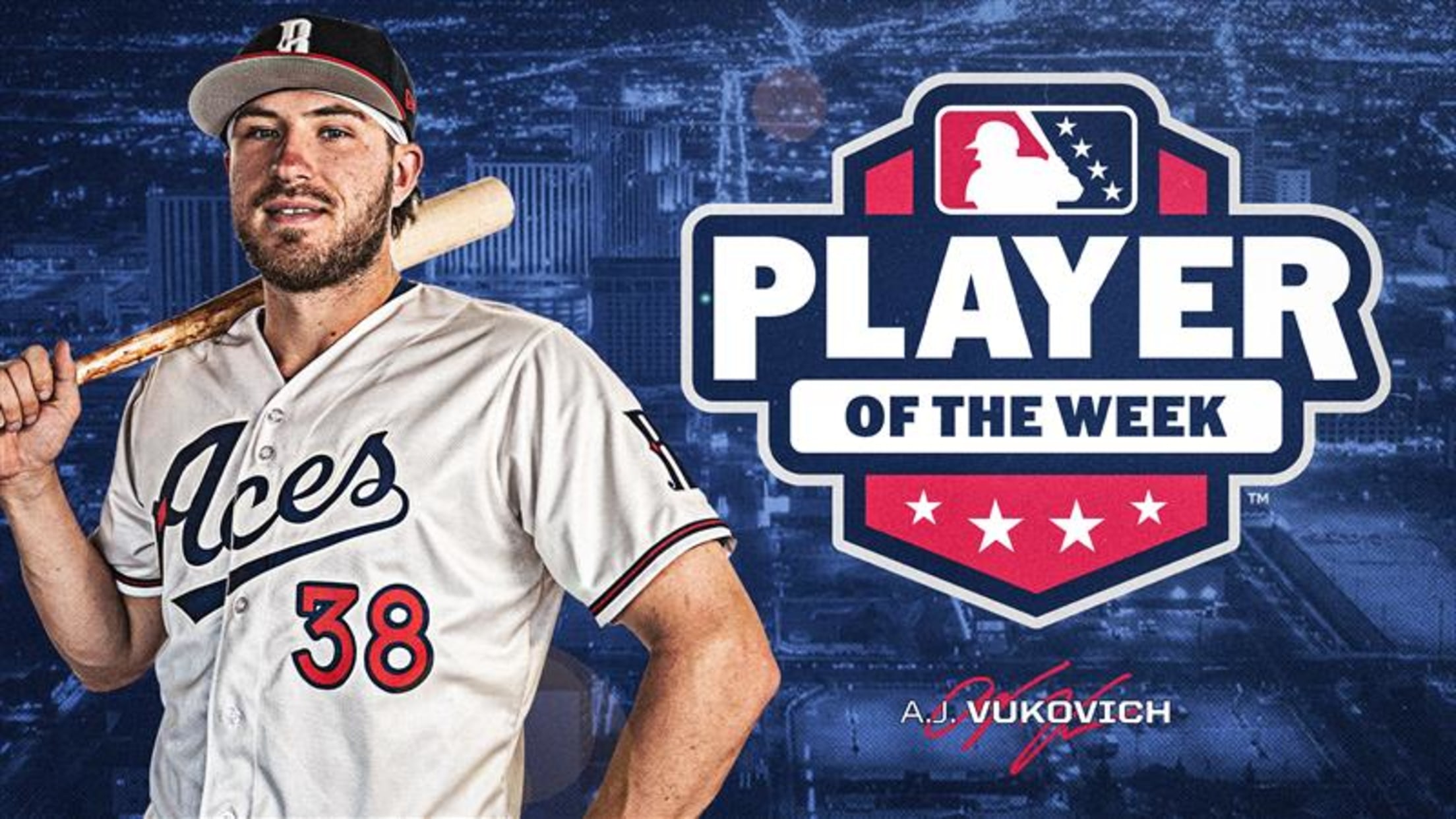 RENO, Nev. – Reno Aces outfielder A.J. Vukovich has been named the Pacific Coast League Player of the Week following another red-hot performance at the plate in Salt Lake. In four games at The Ballpark at America First Square, the 24-year-old slashed .533/.611/1.200 for an OPS of 1.811 in 18