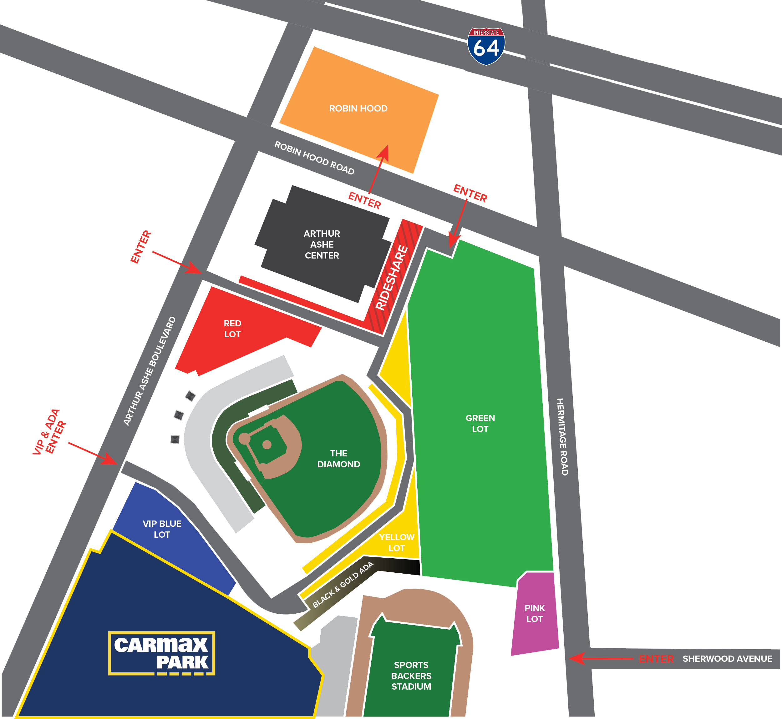 - Black & Gold Lot: ADA Parking. Entrance off Arthur Ashe Boulevard between CarMax Park and The Diamond.