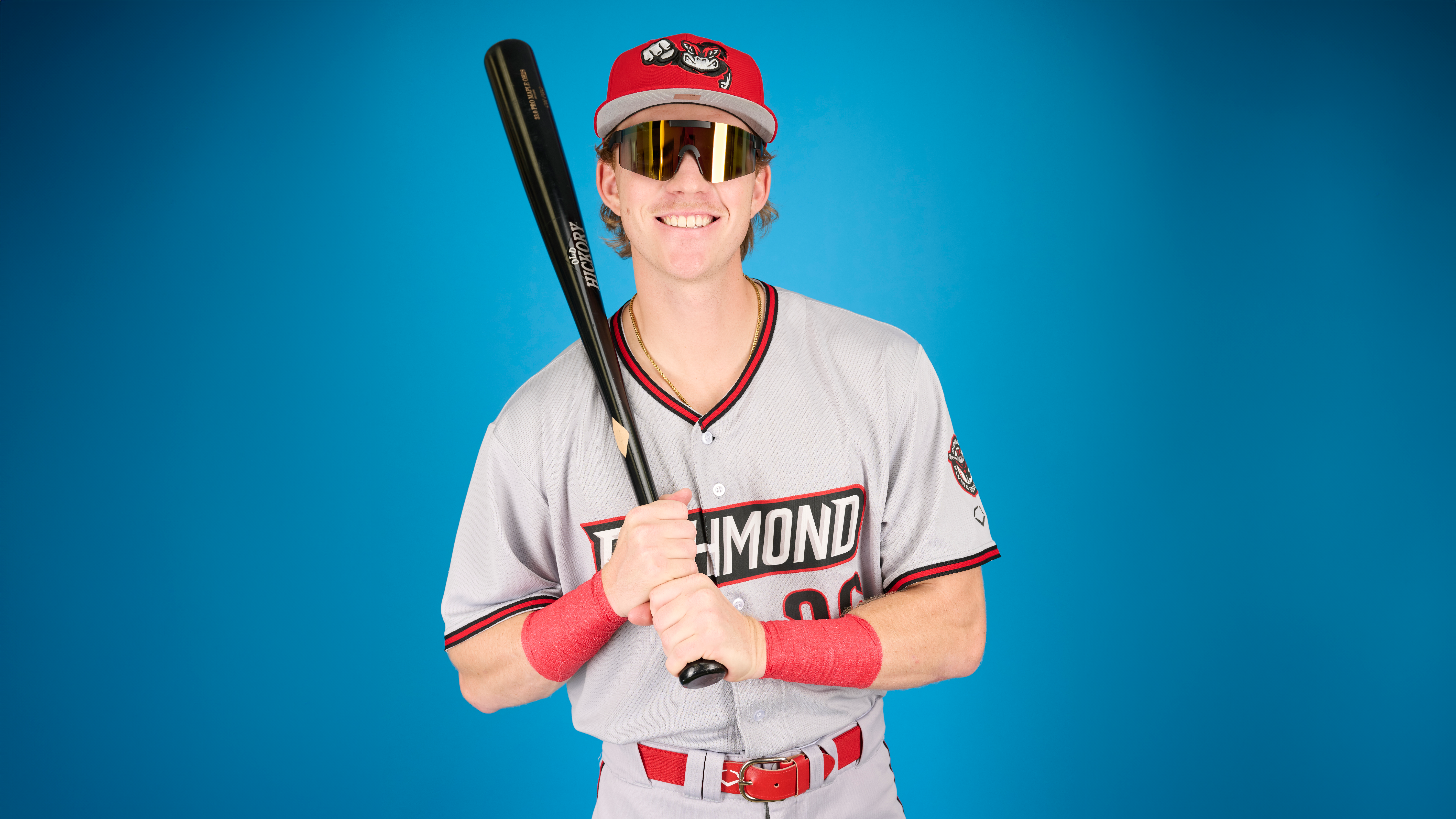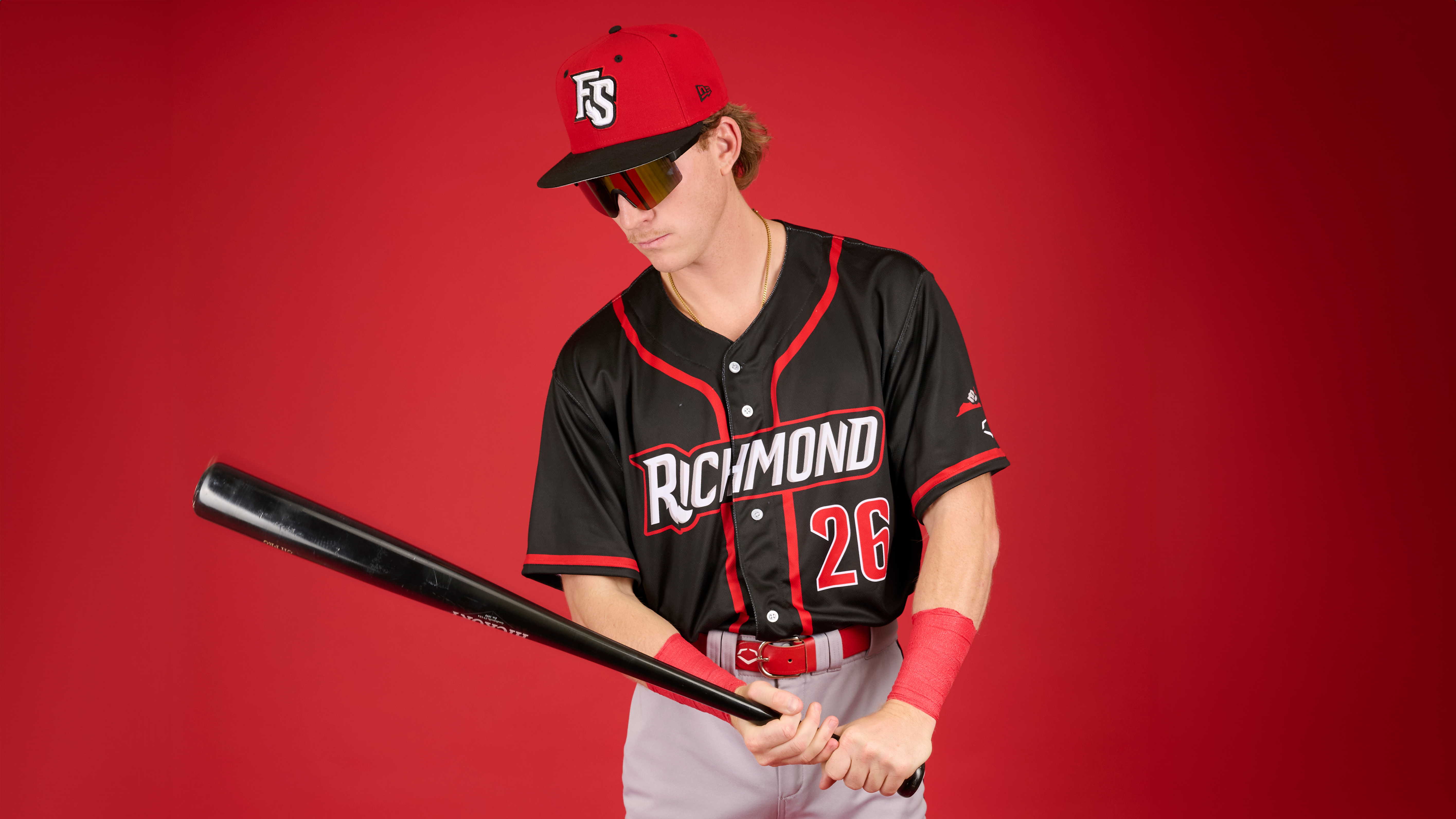 A modernized "Flight Font" adorns the road gray uniforms with “Richmond” over the chest in white lettering, accented in red and black. Red and black piping circles the collar and the sleeves. The new primary roundel logo is depicted on the left sleeve. Black numerals outlined in red sit on the left side of the jersey’s front below the block font while red numerals outlined in black are prominent on the uniform’s backside. The road gray pants are trimmed with red and black piping down the seams and feature a red belt. A red fitted hat displays an action-packed “Power Pose” logo cutting through the air with a clenched fist.