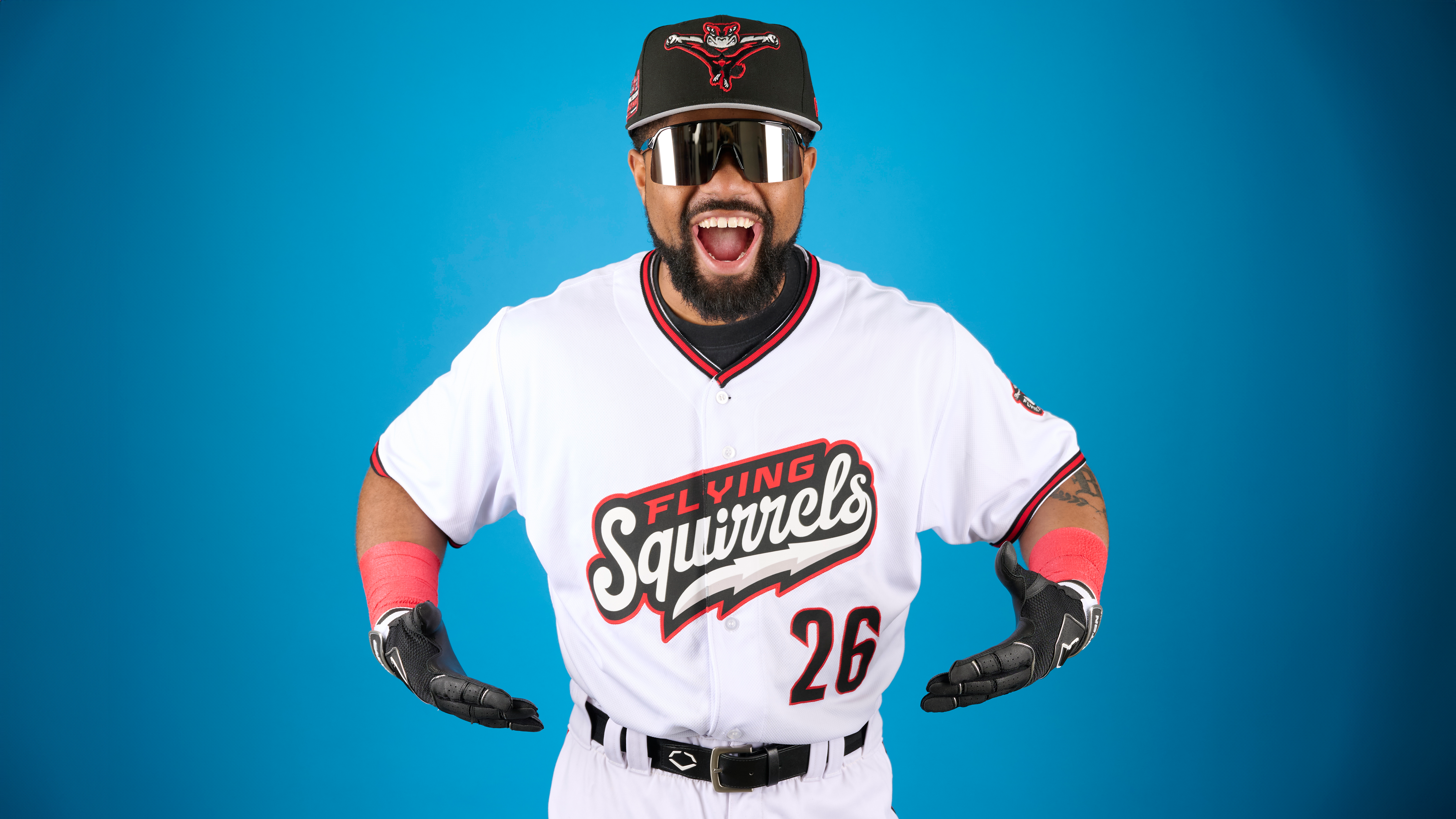 The home white uniforms feature the team's new “Squirrelly Script” font with “Flying Squirrels” across the chest in white, red and black coloring. Squirrels Red and black piping circle the collar and the end of the jersey sleeves. The left sleeve showcases the team’s new primary roundel logo. Black numbers trimmed in red sit on the left side of the jersey below the script. The back of the jersey features red numerals trimmed in black with the name plate in all black lettering. The home white pants are trimmed with red and black piping down the seams and are accented with a black belt. The Flying Squirrels’ dynamic new “Blastoff Pose” logo accentuates an all-black fitted cap along with a specialty CarMax Park Inaugural Season logo on the side.