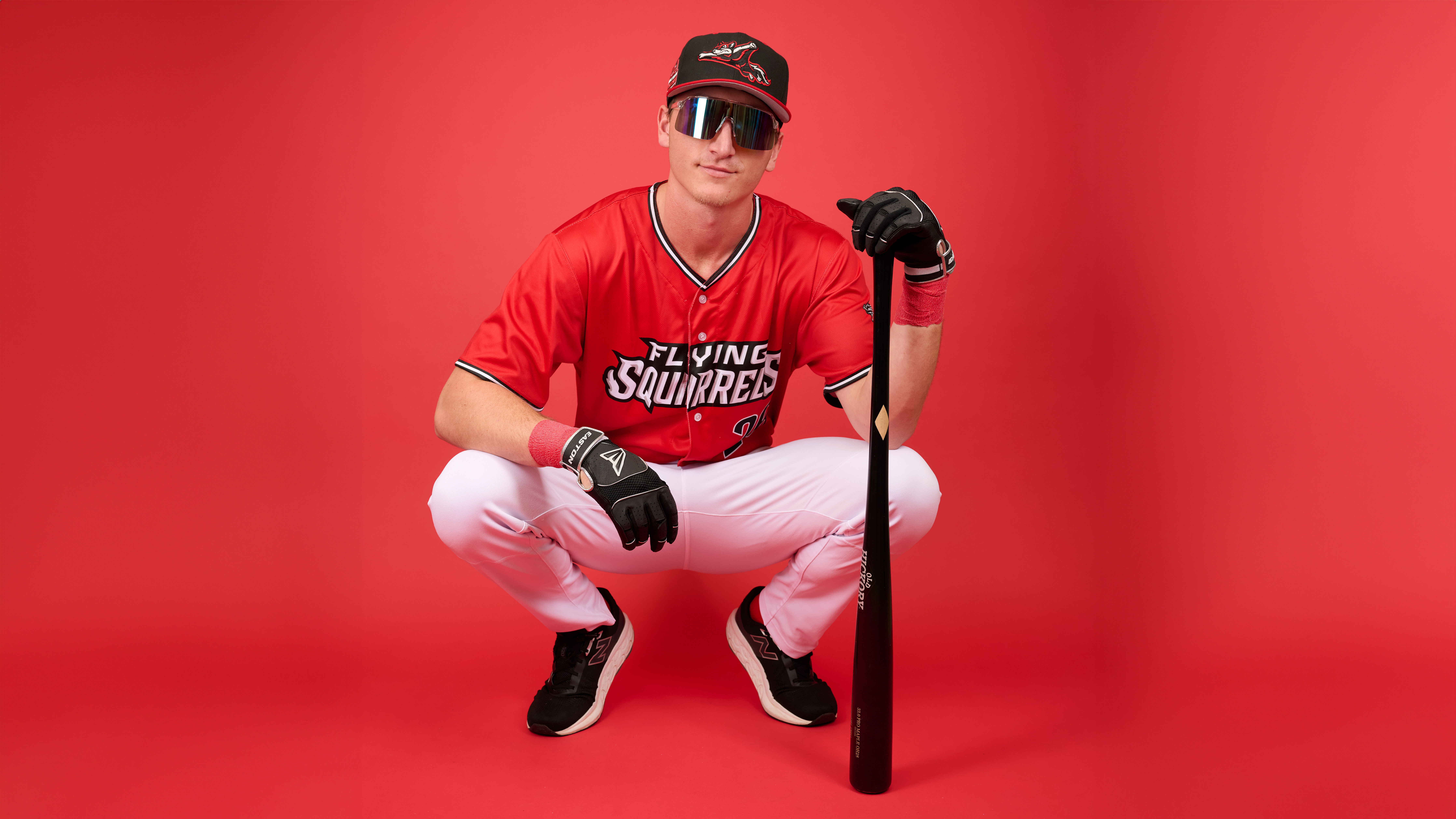 An alternate red jersey showcases “Flying Squirrels" across the chest in white and black colors in the new Flight Font. White and black piping surround the collar and circle the jersey sleeves. The left sleeve is emblazoned with the new primary roundel logo. Black numerals outlined in white rest on the left side of the jersey below the block font. The back of the jersey features white numerals outlined in black. The alternate red jersey is designed to be paired with white or gray pants for wear at home and on the road. The black fitted cap has a red bill and features the redefined “Soar Pose” logo on the front, a nod to the team's primary logo for its first 15 seasons.