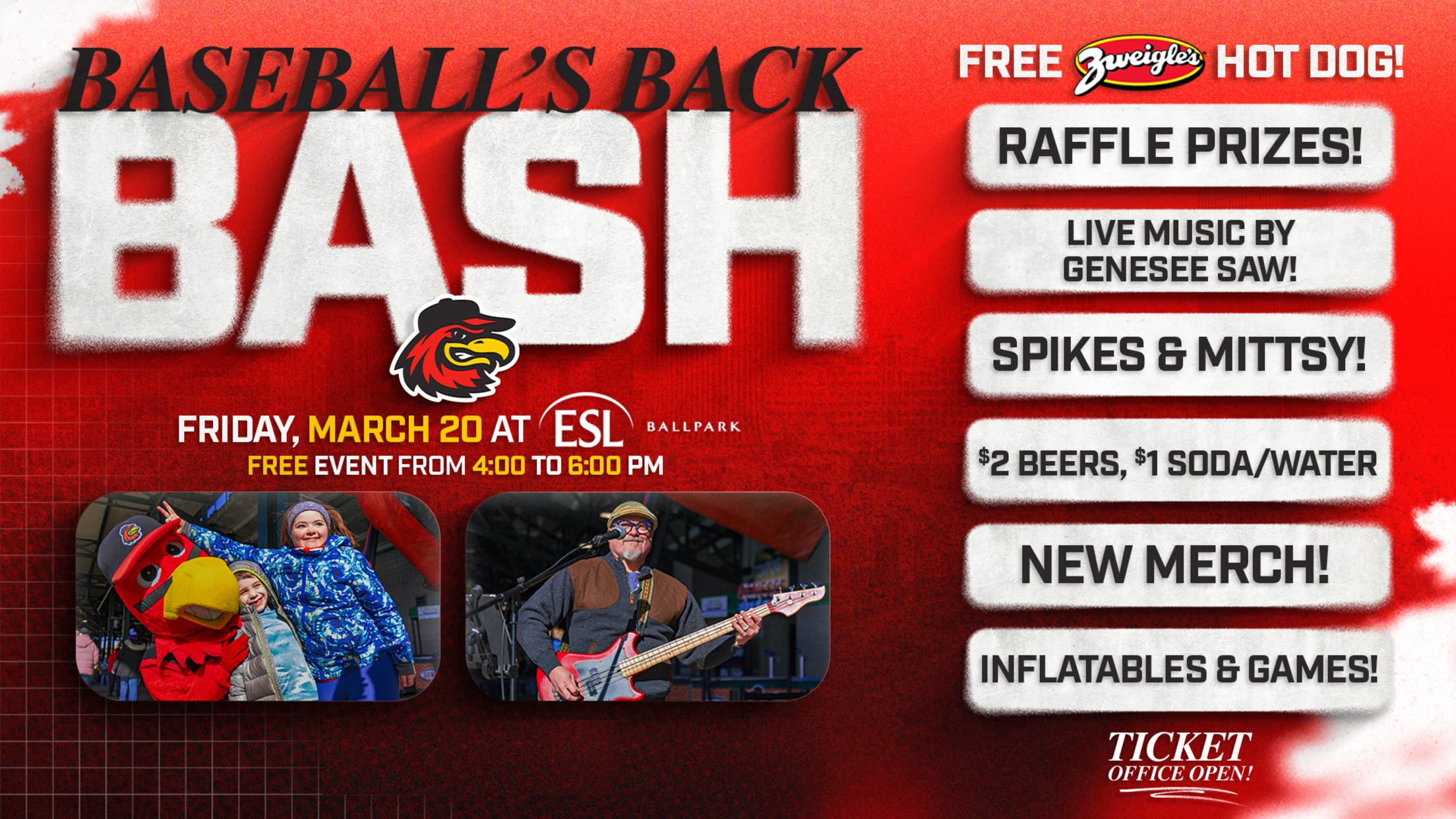 ROCHESTER, NY - The Rochester Red Wings will host their ninth annual Baseball’s Back Bash, presented by Zweigle’s, on Friday, March 20 at ESL Ballpark. This FREE event, marking the official return of fans to the ballpark for the first time in 2026, will run from 4:00 to 6:00 p.m.