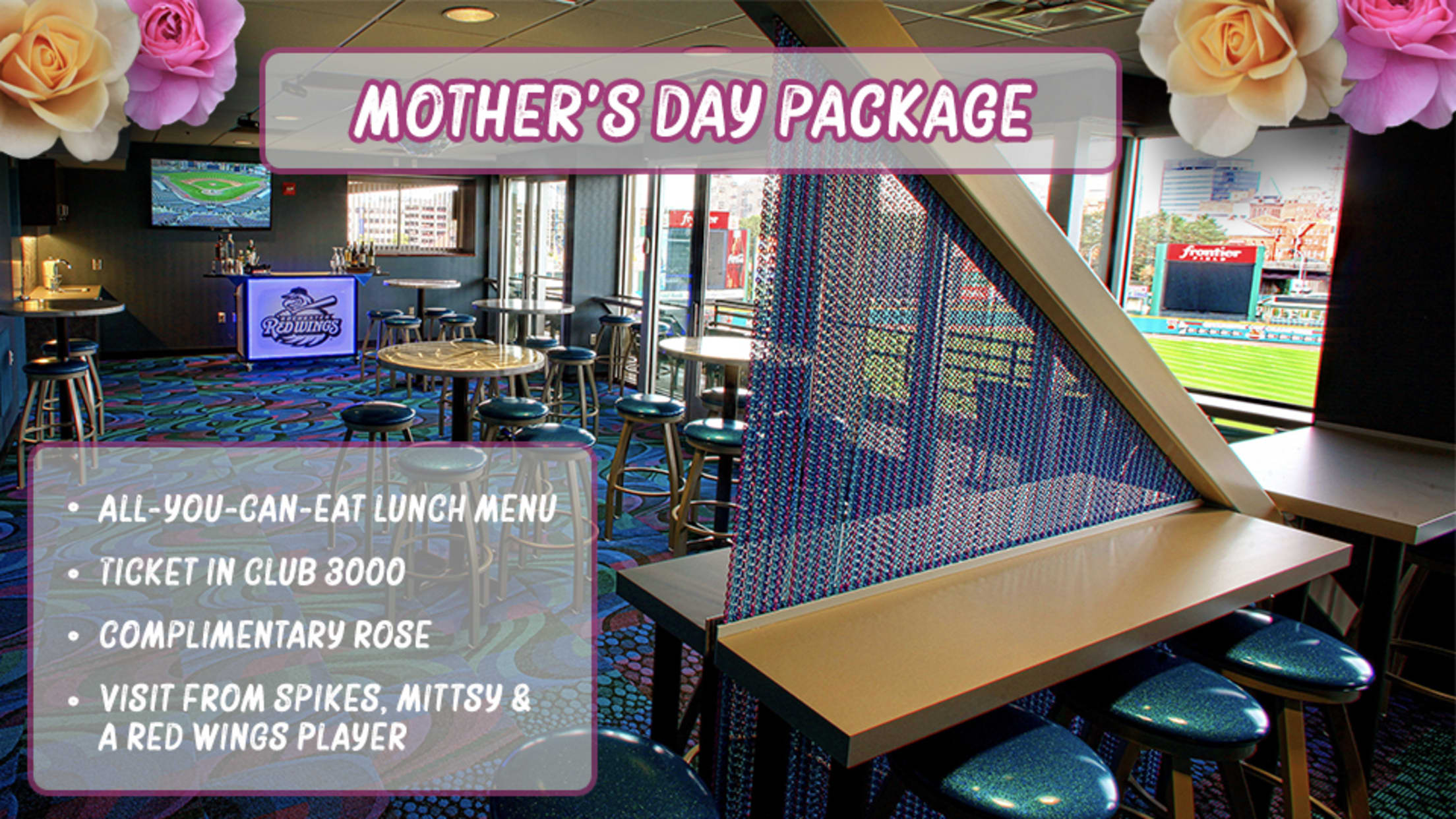 Celebrate Mother's Day with the Wings! The Red Wings are offering a special Mother's Day package on Sunday, May 12 in Club 3000 on the suite level of Frontier Field.