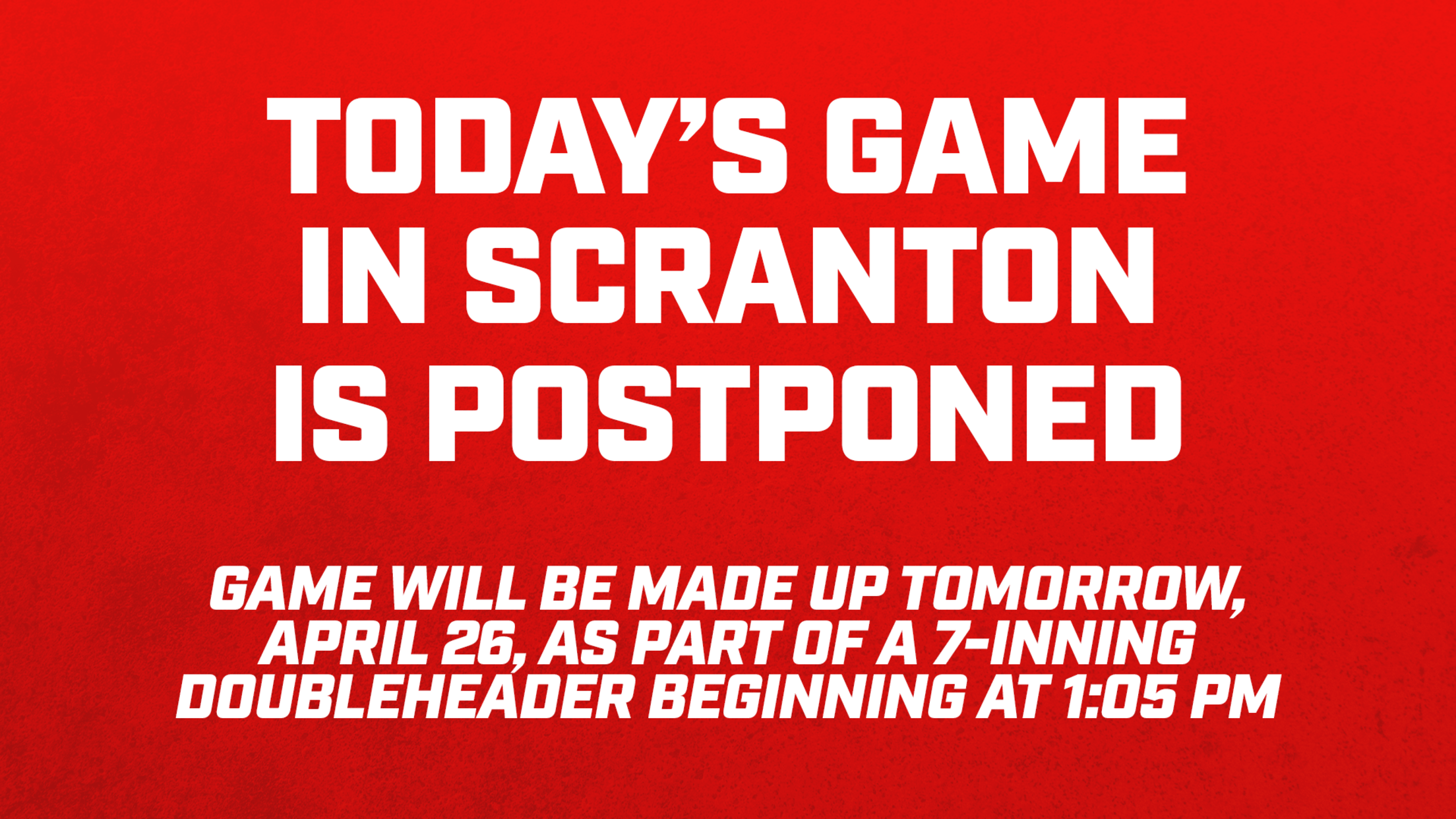 ROCHESTER, NY - Due to inclement weather, today’s game between the Rochester Red Wings and the Lehigh Valley IronPigs at PNC Park in Moosic, PA has been postponed. The two teams will play a seven-inning doubleheader on Sunday, April 26. Game one's first pitch is set for 1:05 p.m. LHP